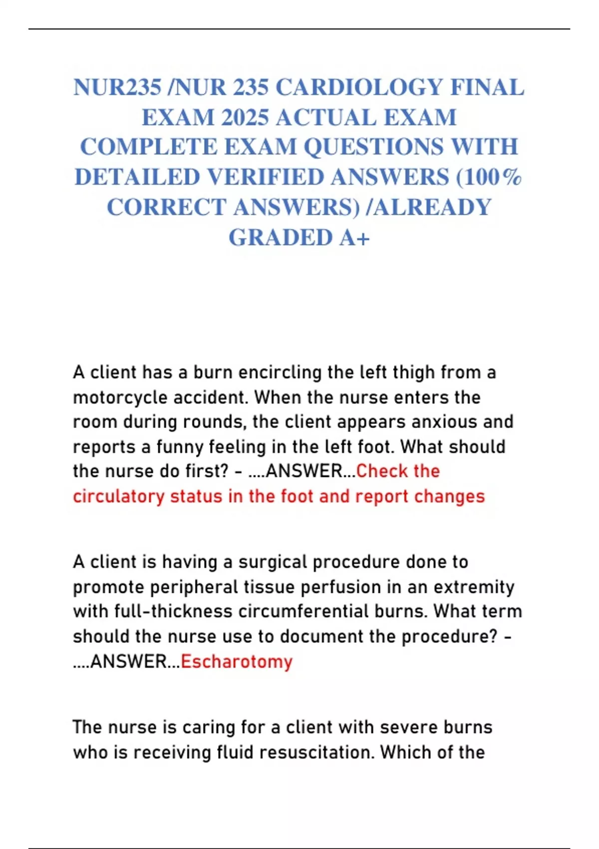 NUR235 /NUR 235 CARDIOLOGY FINAL EXAM 2025 ACTUAL EXAM COMPLETE EXAM QUESTIONS WITH DETAILED VERIFIED ANSWERS (100% CORRECT ANSWERS) /ALREADY GRADED A+