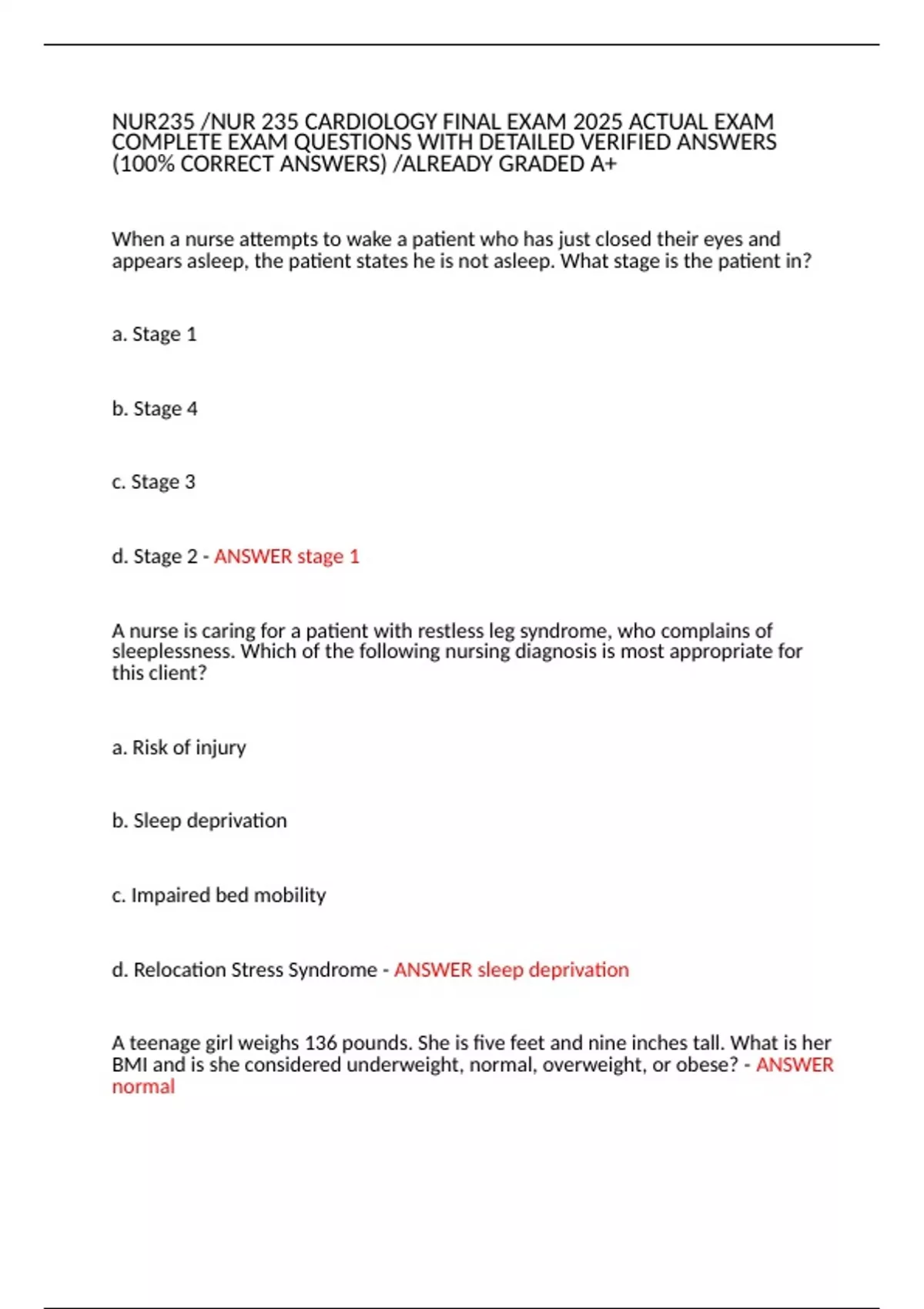 NUR235 /NUR 235 CARDIOLOGY FINAL EXAM 2025 ACTUAL EXAM