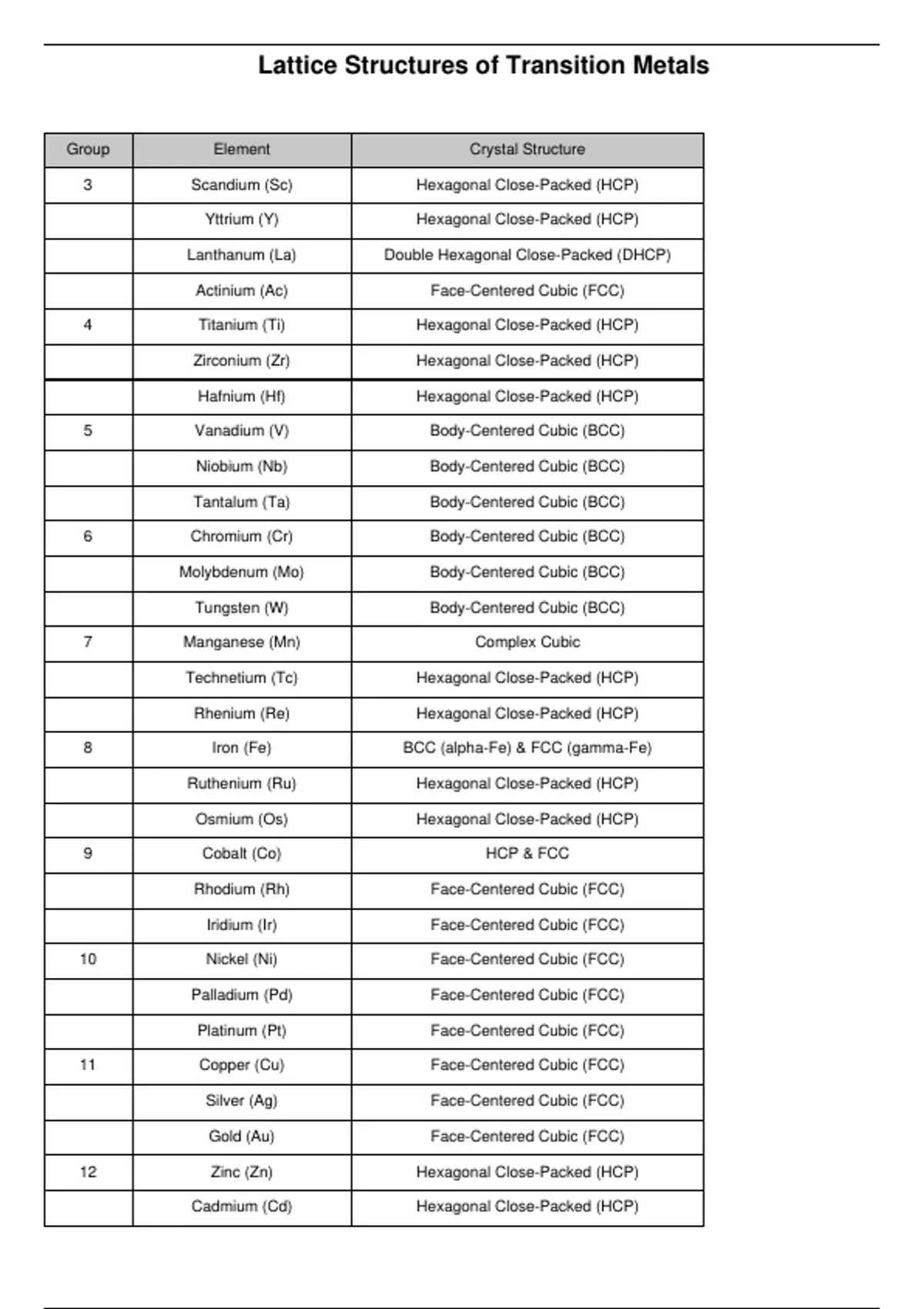 12 Zinc (Zn) Hexagonal Close-Packed (HCP)