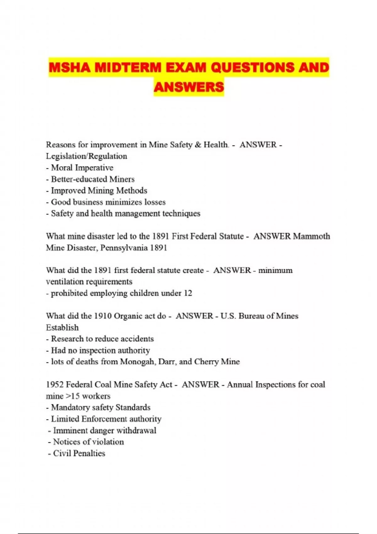 MSHA MIDTERM EXAM QUESTIONS AND ANSWERS
