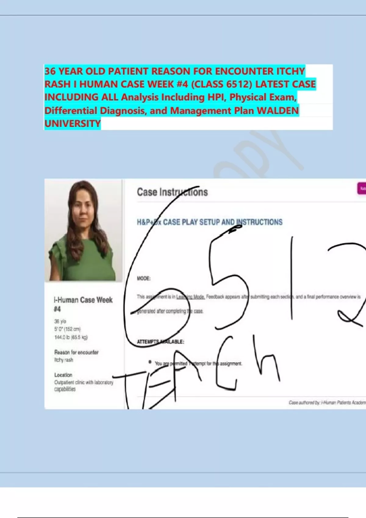 36 YEAR OLD PATIENT REASON FOR ENCOUNTER ITCHY RASH I HUMAN CASE WEEK #4 (CLASS 6512) LATEST CASE INCLUDING ALL Analysis Including HPI, Physical Exam, Differential Diagnosis, and Management Plan WALDEN UNIVERSITY