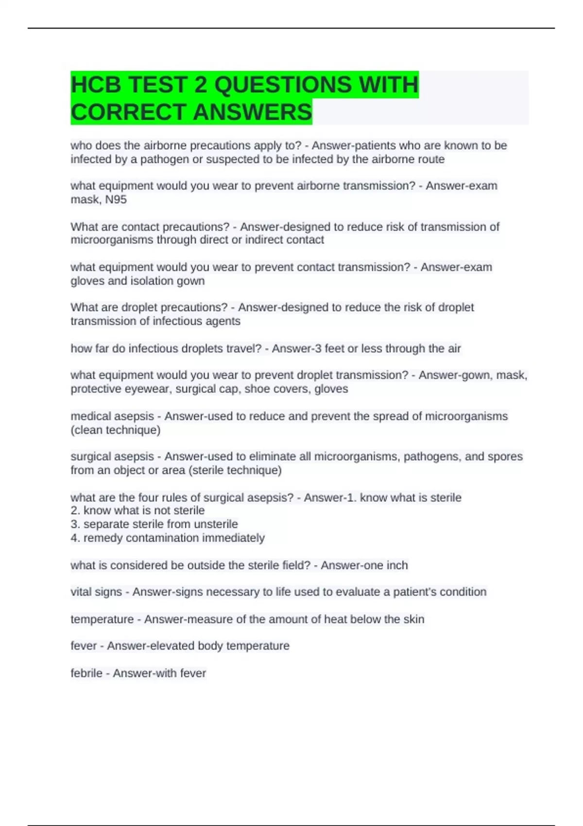 HCB TEST 2 QUESTIONS WITH CORRECT ANSWERS