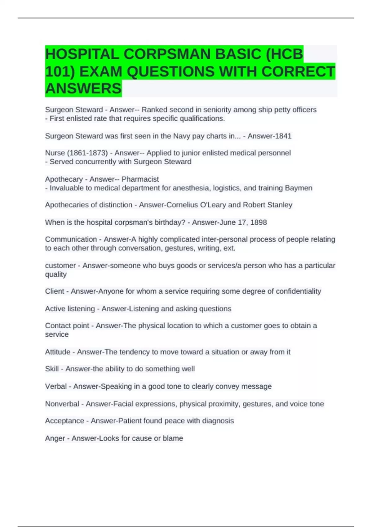 HOSPITAL CORPSMAN BASIC (HCB 101) EXAM QUESTIONS WITH CORRECT ANSWERS
