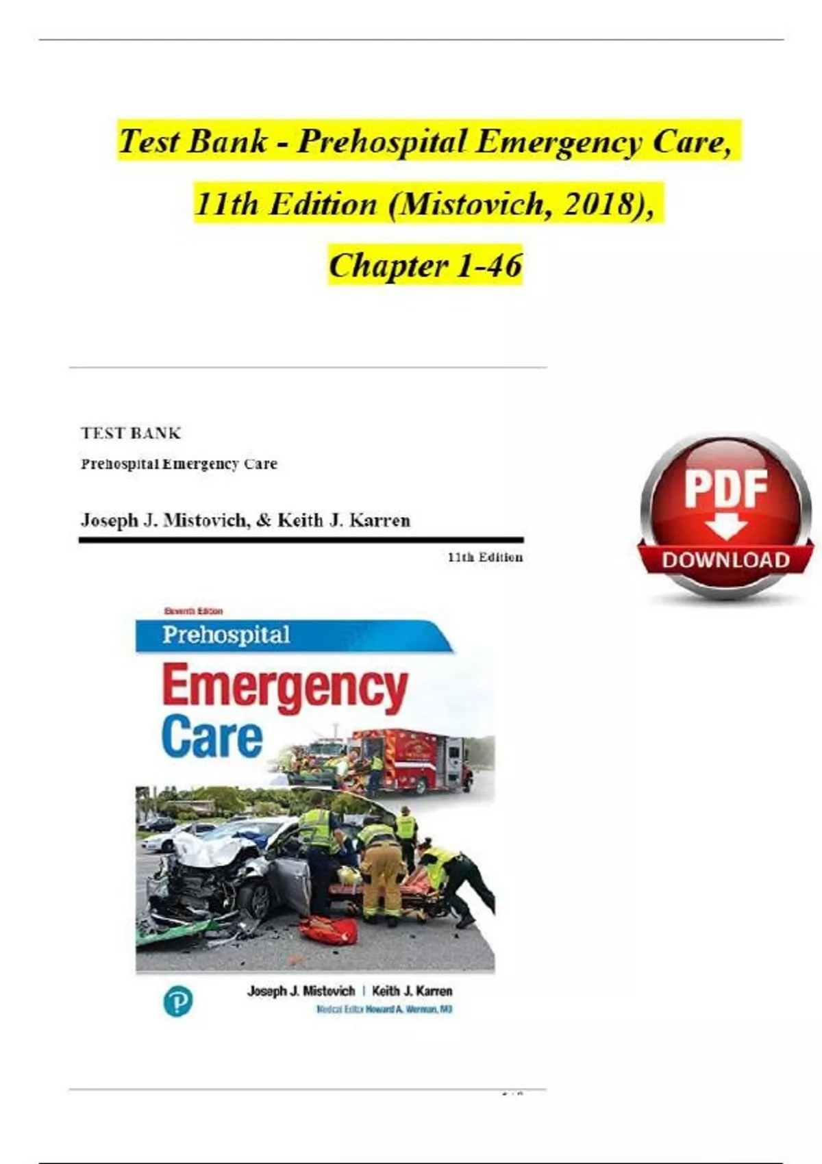 TEST BANK FOR PREHOSPITAL EMERGENCY CARE, 11TH EDITION BY JOSEPH MISTOVICH (Complete Test Bank Chapters 1-46) Prehospital Emergency Care, 11th edition (Mistovich et al.) Test Bank Table of Contents: PART 1: PREPARATORY AND PUBLIC HEALTH 1. Emergency Medical Care Systems, Research, and Public Health 2. Workforce Safety and Wellness of the EMT 3. Medical, Legal, and Ethical Issues 4. Documentation 5. Communication 6. Lifting and Moving Patients PART 2: ANATOMY, PHYSIOLOGY, AND MEDICAL TERMINOLOGY 7. Anatomy, Physiology, and Medical Terminology PART 3: PATHOPHYSIOLOGY 8. Pathophysiology PART 4: SPAN DEVELOPMENT 9. Life Span Development PART 5: AIRWAY MANAGEMENT, ARTIFICIAL VENTILATION, AND OXYGENATION 10. Airway Management, Artificial Ventilation, and Oxygenation PART 6: ASSESSMENT 11. Vital Signs, Monitoring Devices, and History Taking 12. Scene Size-Up13. Patient Assessment PART 7: GENERAL PHARMACOLOGY AND MEDICATION ADMINISTRATION 14. General Pharmacology and Medication Administration PART 8: SHOCK AND RESUSCITATION 15. Shock and Resuscitation PART 9: MEDICINE 16. Respiratory Emergencies 17. Cardiovascular Emergencies 18. Altered Mental Status, Stroke, and Headache 19. Seizures and Syncope 20. Acute Diabetic Emergencies 21. Allergic and Anaphylactic Reactions 22. Toxicologic Emergencies 23. Abdominal, Hematologic, Gynecologic, Genitourinary, and Renal Emergencies 24. Environmental Emergencies 25. Submersion Incidents: Drowning and Diving Emergencies 26. Psychiatric Emergencies PART 10: TRAUMA 27. Trauma Overview: The Trauma Patient and the Trauma System 28. Bleeding and Soft Tissue Trauma 29. Burns 30. Musculoskeletal Trauma and Nontraumatic Fractures 31. Head Trauma 32. Spinal Trauma and Spine Motion Restriction 33. Eye, Face, and Neck Trauma 34. Chest Trauma 35. Abdominal and Genitourinary Trauma 36. Multisystem Trauma and Trauma in Special Patient Populations PART 11: SPECIAL PATIENT POPULATIONS 37. Obstetrics and Care of the Newborn 38. Pediatrics 39. Geriatrics 40. Patients with Special Challenges 41. The Combat Veteran PART 12: EMS OPERATIONS 42. Ambulance Operations and Air Medical Response 43. Gaining Access and Patient Extrication 44. Hazardous Materials 45. Multiple-Casualty Incidents and Incident Management 46. EMS Response to Terrorist Incidents