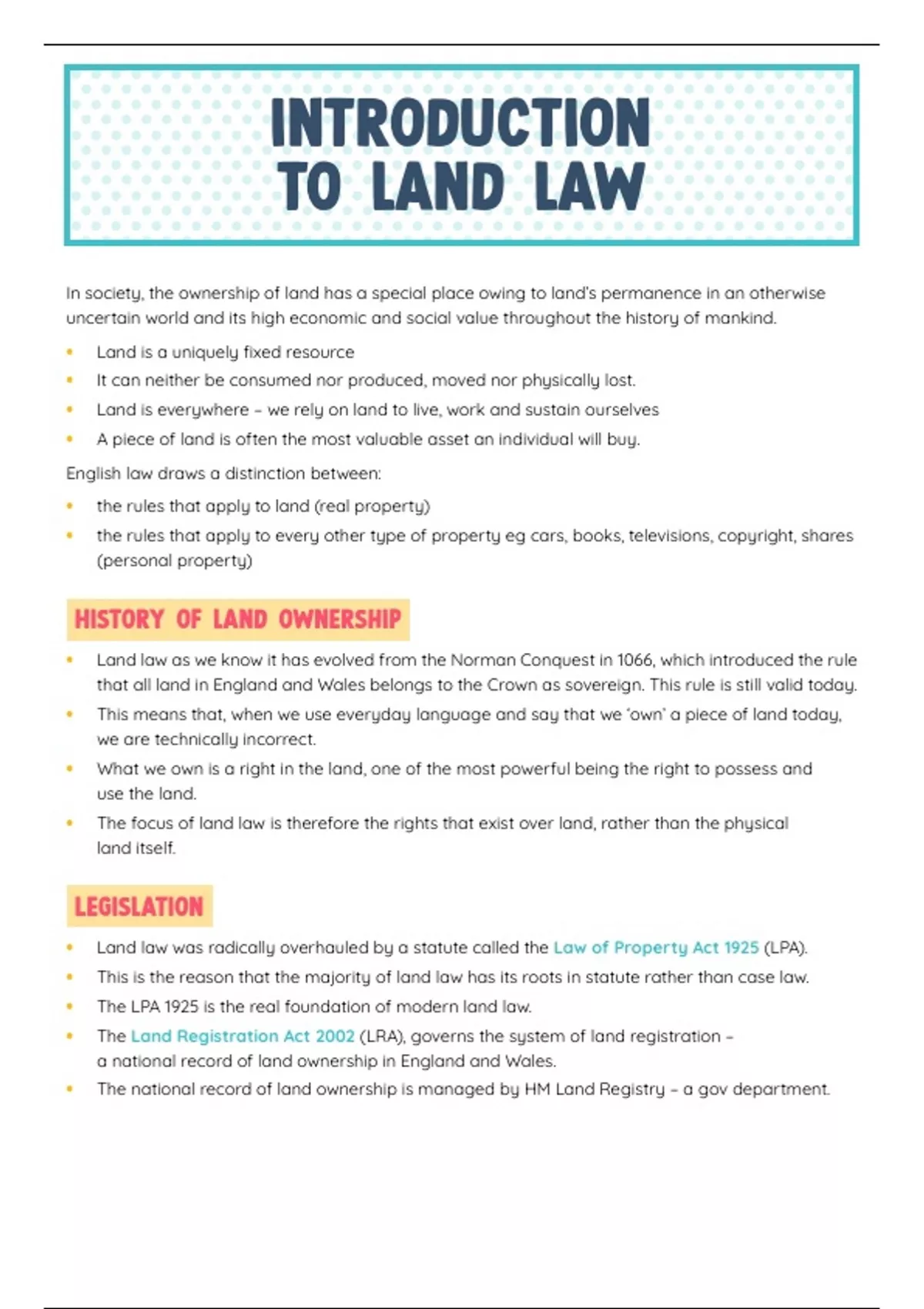 • This is the reason that the majority of land law has its roots in statute rather than case law.
