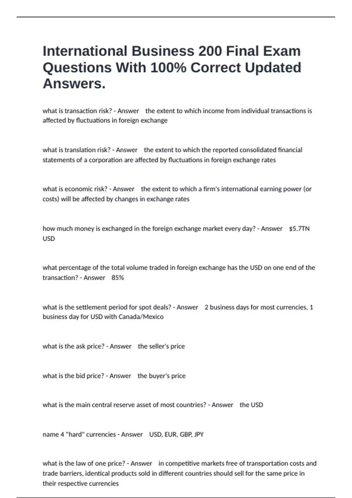 what is transaction risk? - Answer the extent to which income from individual transactions is affected by fluctuations in foreign exchange what is translation risk? - Answer the extent to which the reported consolidated financial statements of a corporation are affected by fluctuations in foreign exchange rates what is economic risk? - Answer the extent to which a firm's international earning power (or costs) will be affected by changes in exchange rates how much money is exchanged in the foreign exchange market every day? - Answer $5.7TN USD what percentage of the total volume traded in foreign exchange has the USD on one end of the transaction? - Answer 85% what is the settlement period for spot deals? - Answer 2 business days for most currencies, 1 business day for USD with Canada/Mexico what is the ask price? - Answer the seller's price what is the bid price? - Answer the buyer's price what is the main central reserve asset of most countries? - Answer the USD name 4 "hard" currencies - Answer USD, EUR, GBP, JPY what is the law of one price? - Answer in competitive markets free of transportation costs and trade barriers, identical products sold in different countries should sell for the same price in their respective currencies what is the purchasing power parity? - Answer in efficient markets, comparison of a roughly equivalent basket of goods b/w different nations should approximate the real or PPP exchange rate