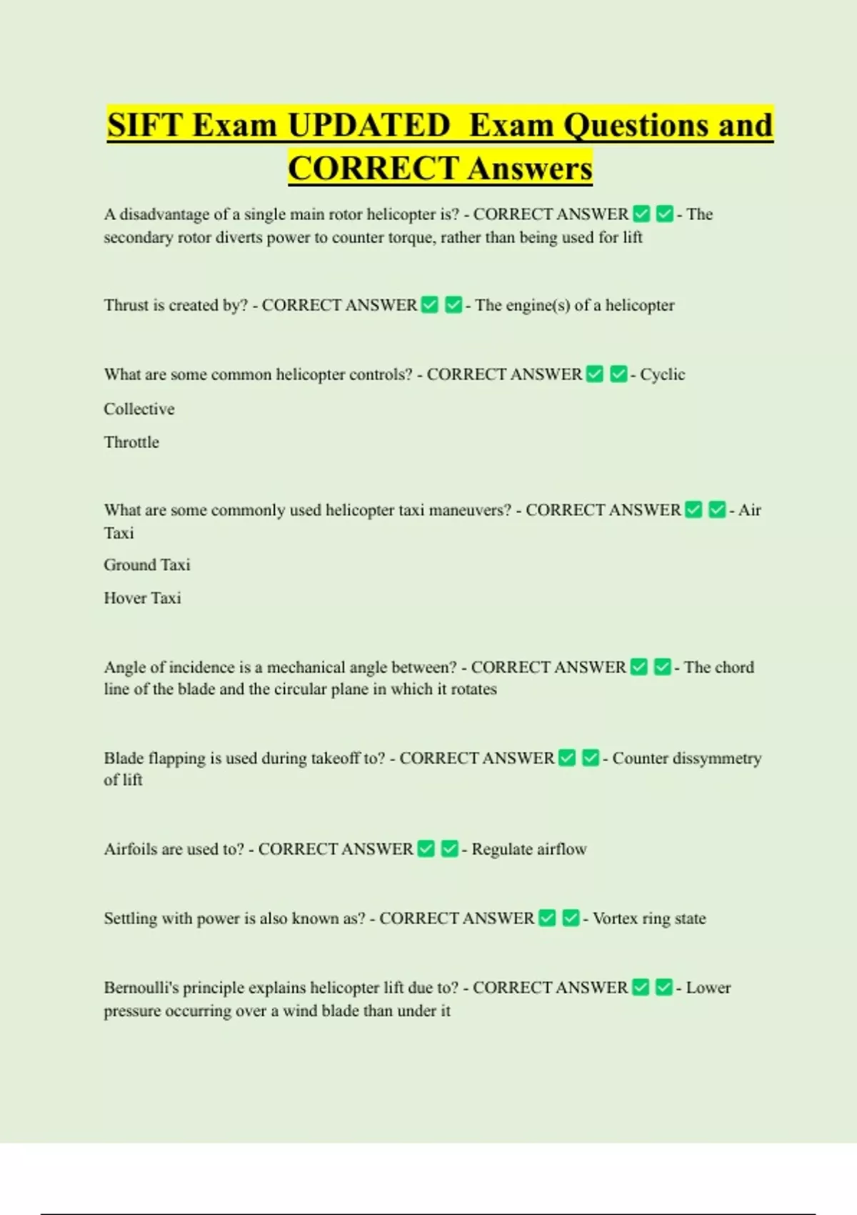 SIFT Exam UPDATED Exam Questions and CORRECT Answers A disadvantage of a single main rotor helicopter is? - CORRECT ANSWER secondary rotor diverts power to counter torque, rather than being used for lift Thrust is created by? - CORRECT ANSWER - The engine(s) of a helicopter What are some common helicopter controls? - CORRECT ANSWER Collective Throttle - The - Cyclic