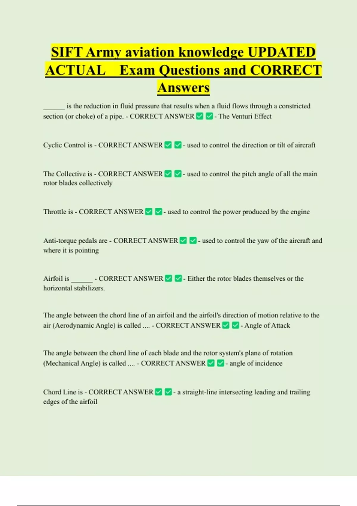 SIFT Army aviation knowledge UPDATED ACTUAL Exam Questions and CORRECT Answers ______ is the reduction in fluid pressure that results when a fluid flows through a constricted section (or choke) of a pipe. - CORRECT ANSWER - The Venturi Effect Cyclic Control is - CORRECT ANSWER The Collective is - CORRECT ANSWER rotor blades collectively Throttle is - CORRECT ANSWER Anti-torque pedals are - CORRECT ANSWER where it is pointing Airfoil is ______ - CORRECT ANSWER horizontal stabilizers. - used to control the direction or tilt of aircraft - used to control the pitch angle of all the main