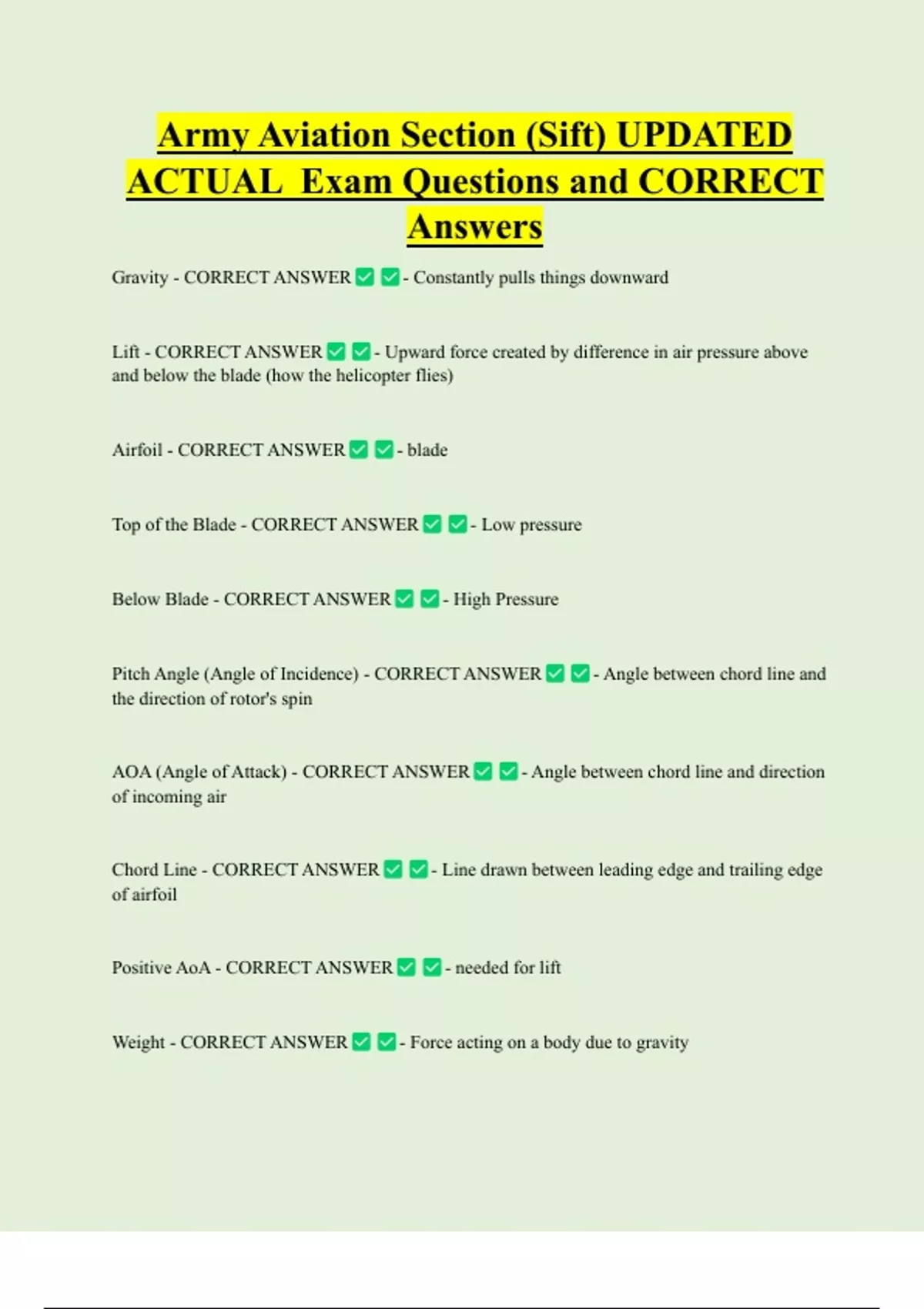 Army Aviation Section (Sift) UPDATED ACTUAL Exam Questions and CORRECT Answers Gravity - CORRECT ANSWER Lift - CORRECT ANSWER - Constantly pulls things downward - Upward force created by difference in air pressure above and below the blade (how the helicopter flies) Airfoil - CORRECT ANSWER - blade Top of the Blade - CORRECT ANSWER Below Blade - CORRECT ANSWER - Low pressure