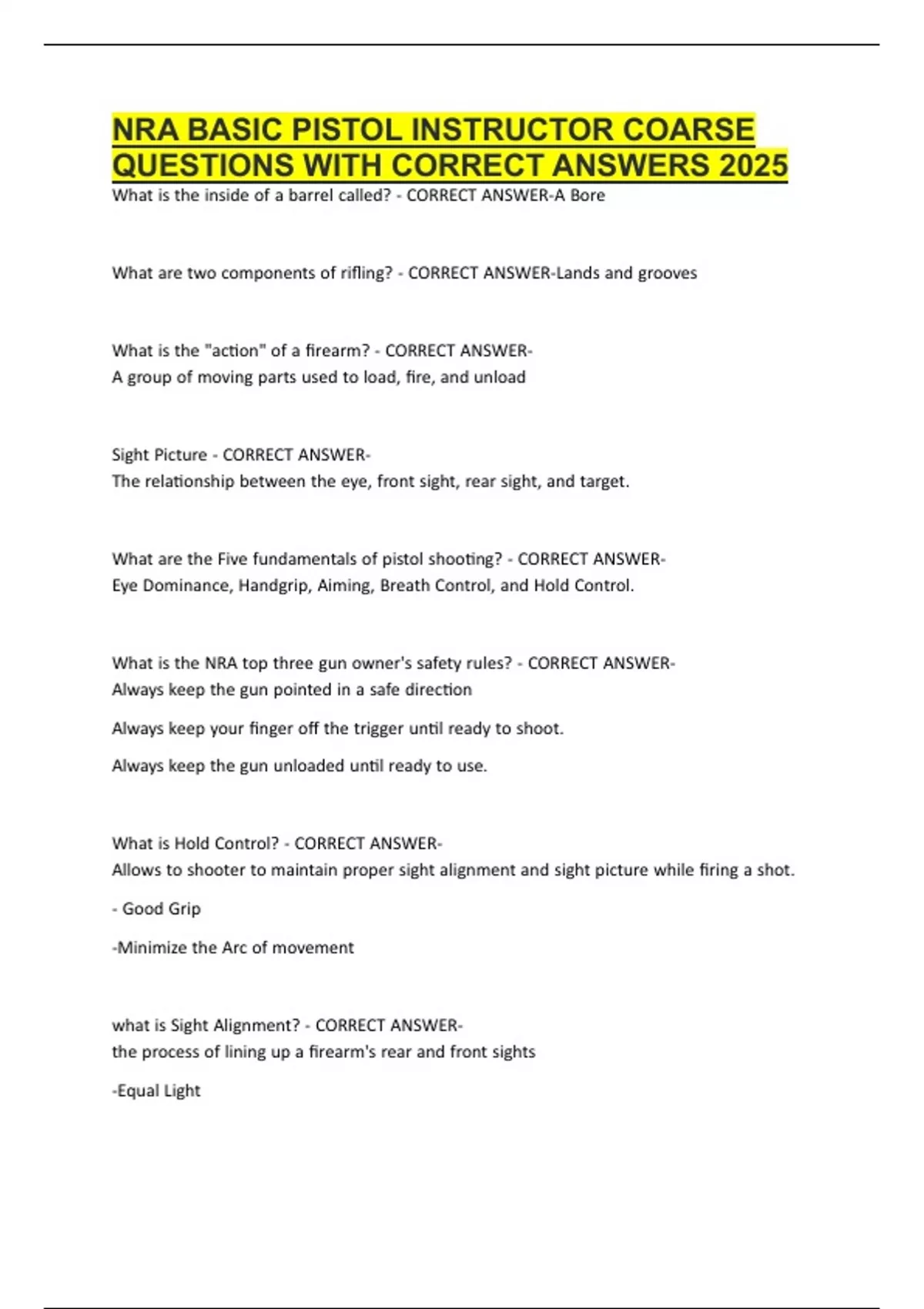 NRA BASIC PISTOL INSTRUCTOR COARSE QUESTIONS WITH CORRECT ANSWERS 2025