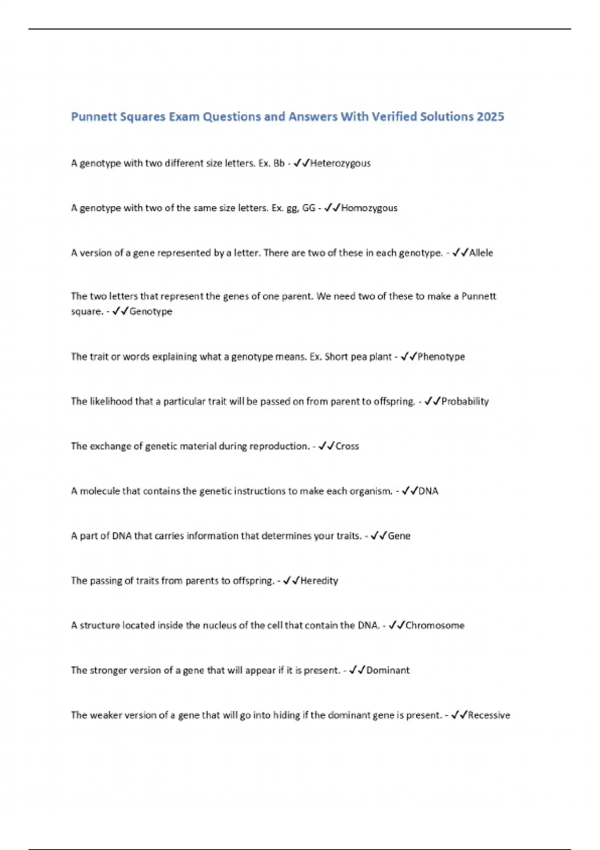 Punnett Squares Exam Questions and Answers With Verified Solutions 2025