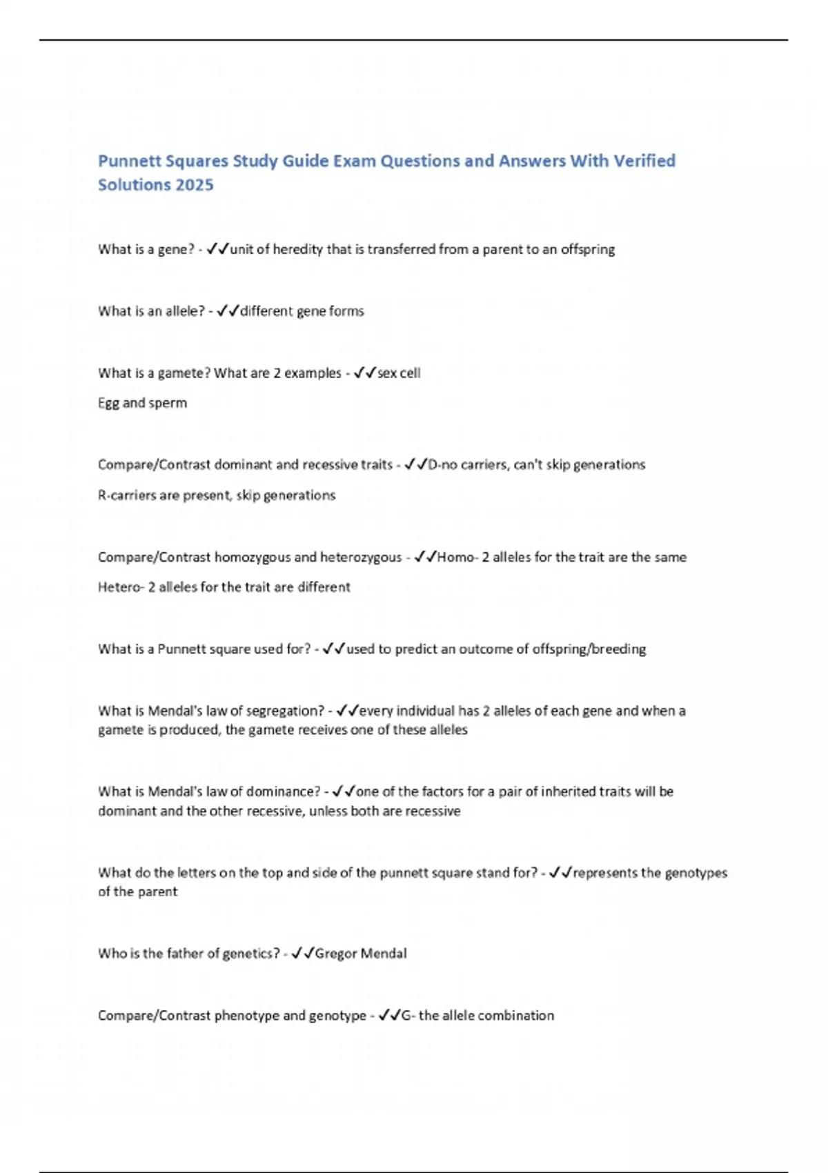 Punnett Squares Study Guide Exam Questions and Answers With Verified Solutions 2025