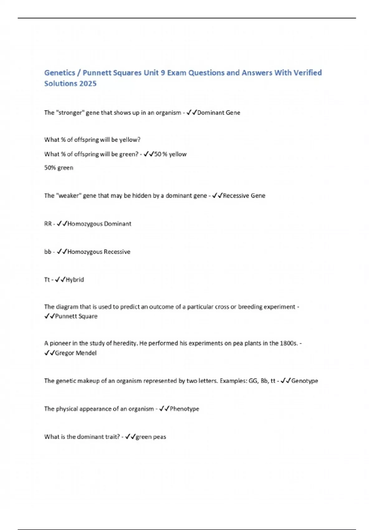 Genetics / Punnett Squares Unit 9 Exam Questions and Answers With Verified Solutions 2025