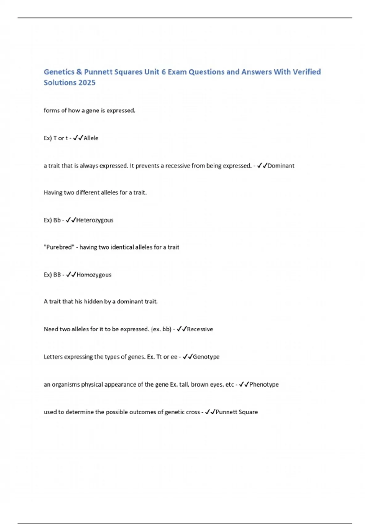Genetics & Punnett Squares Unit 6 Exam Questions and Answers With Verified Solutions 2025