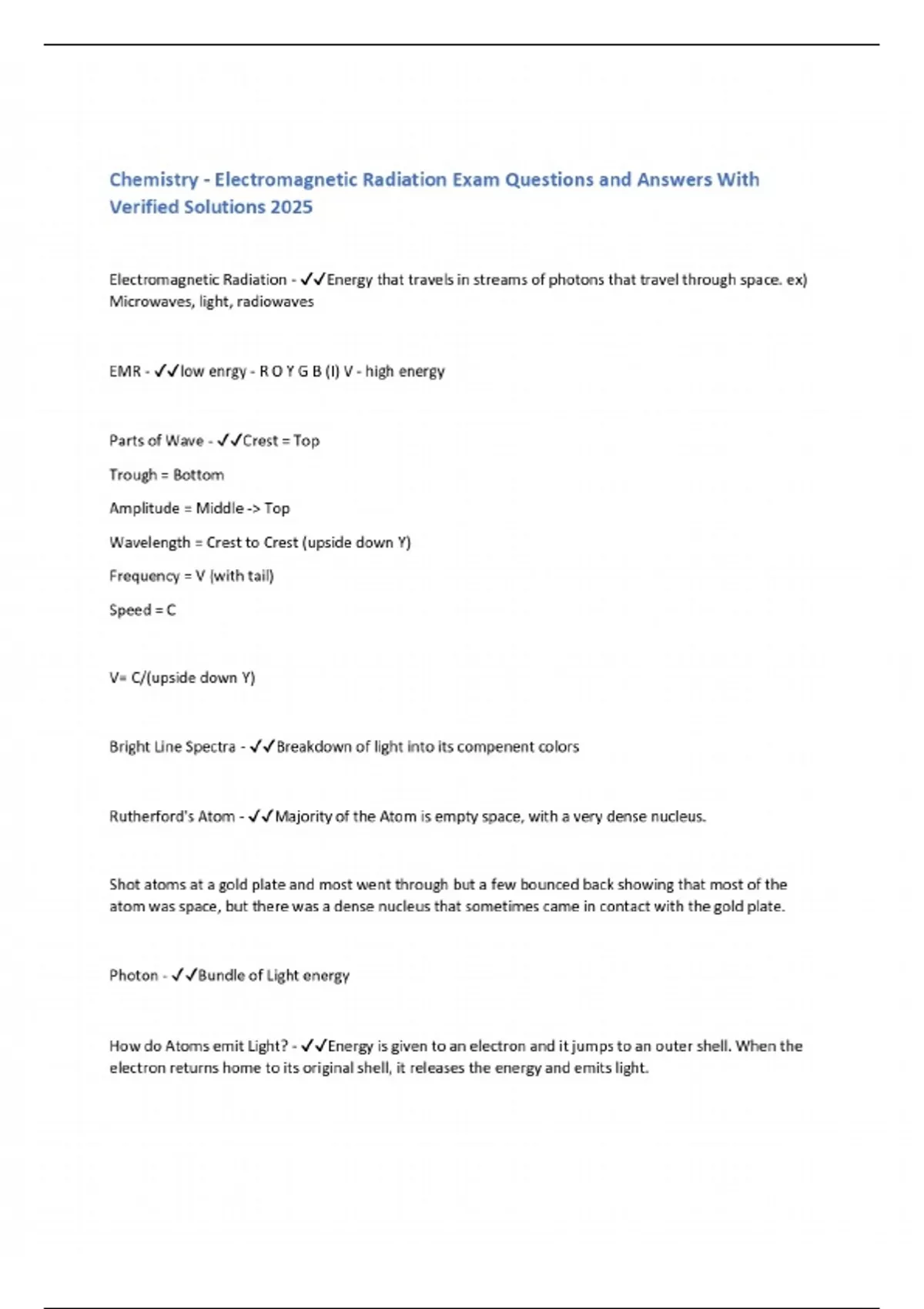 Chemistry - Electromagnetic Radiation Exam Questions and Answers With Verified Solutions 2025
