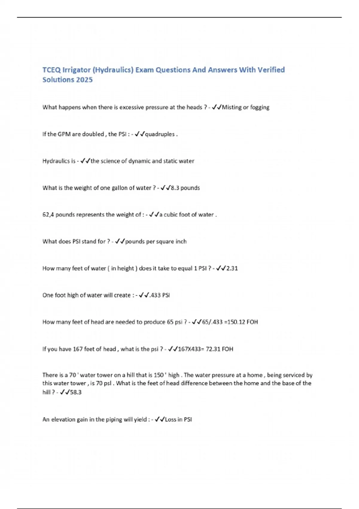TCEQ Irrigator (Hydraulics) Exam Questions And Answers With Verified Solutions 2025