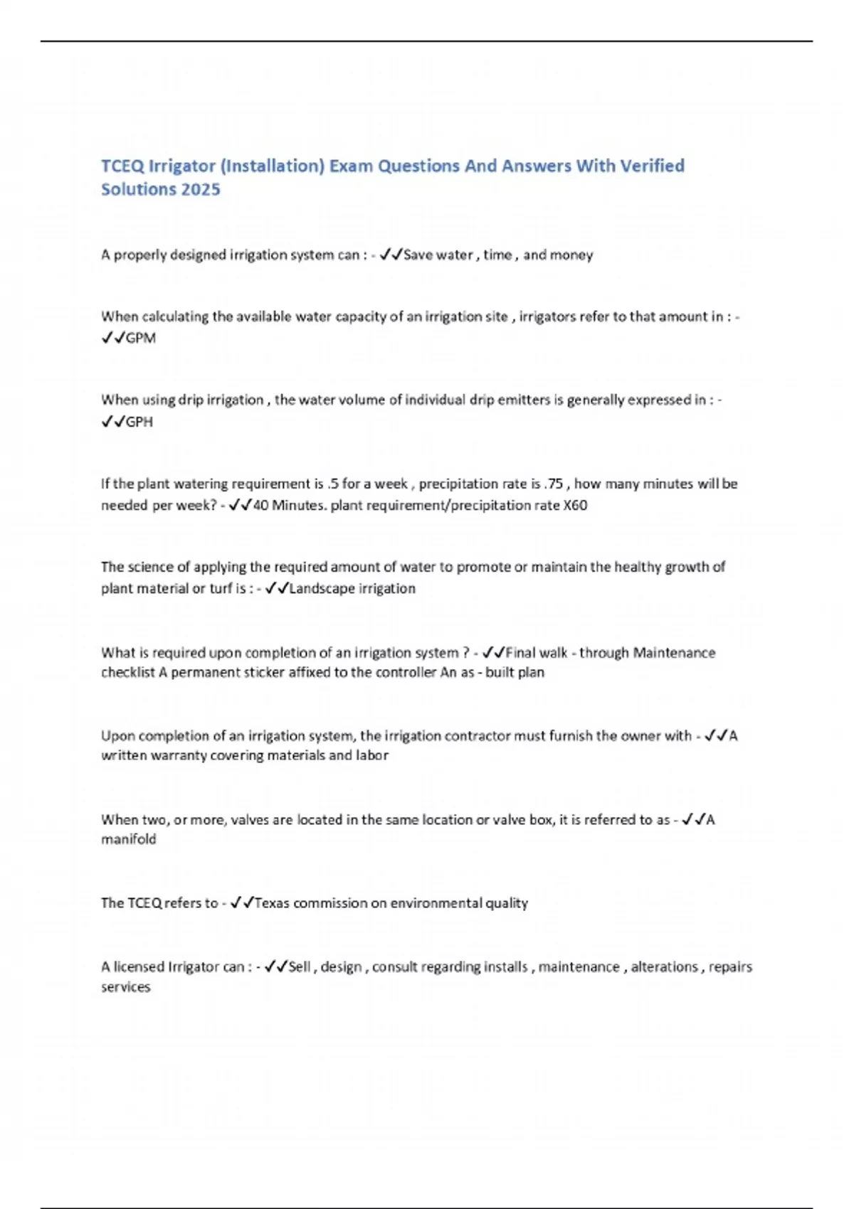 TCEQ Irrigator (Installation) Exam Questions And Answers With Verified Solutions 2025