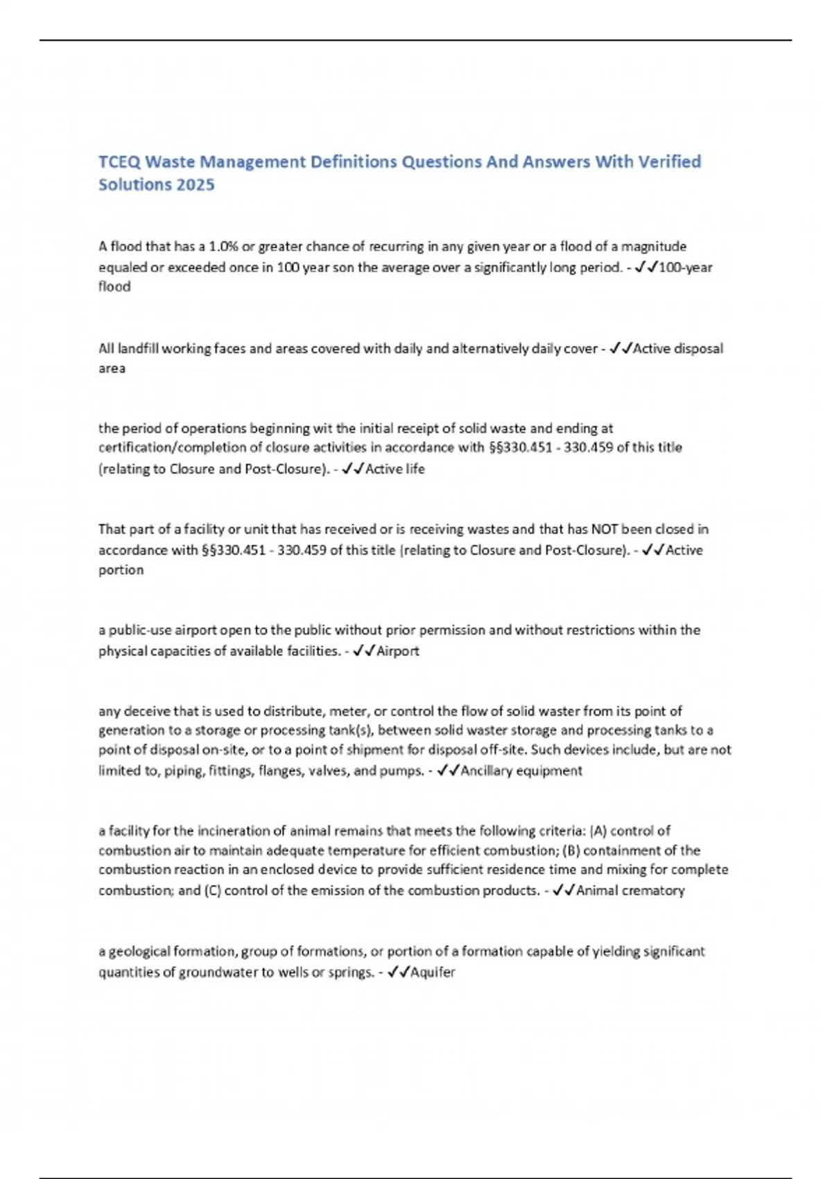 TCEQ Waste Management Definitions Questions And Answers With Verified Solutions 2025