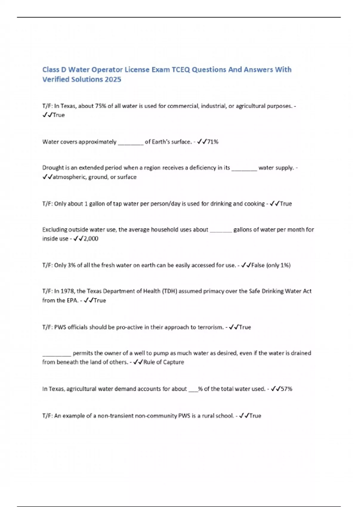 Class D Water Operator License Exam TCEQ Questions And Answers With Verified Solutions 2025