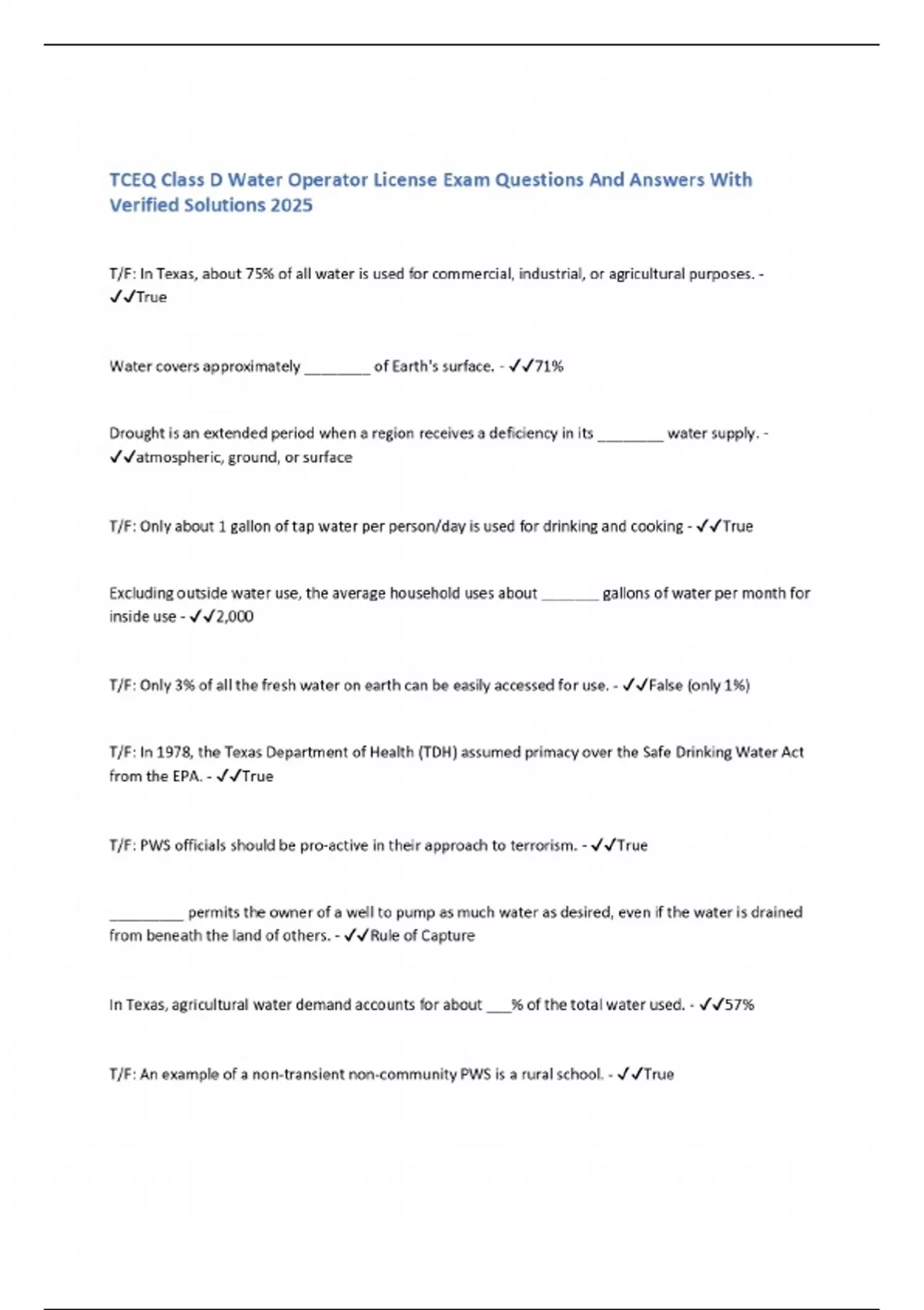 TCEQ Class D Water Exam Questions And Answers With Verified Solutions 2025