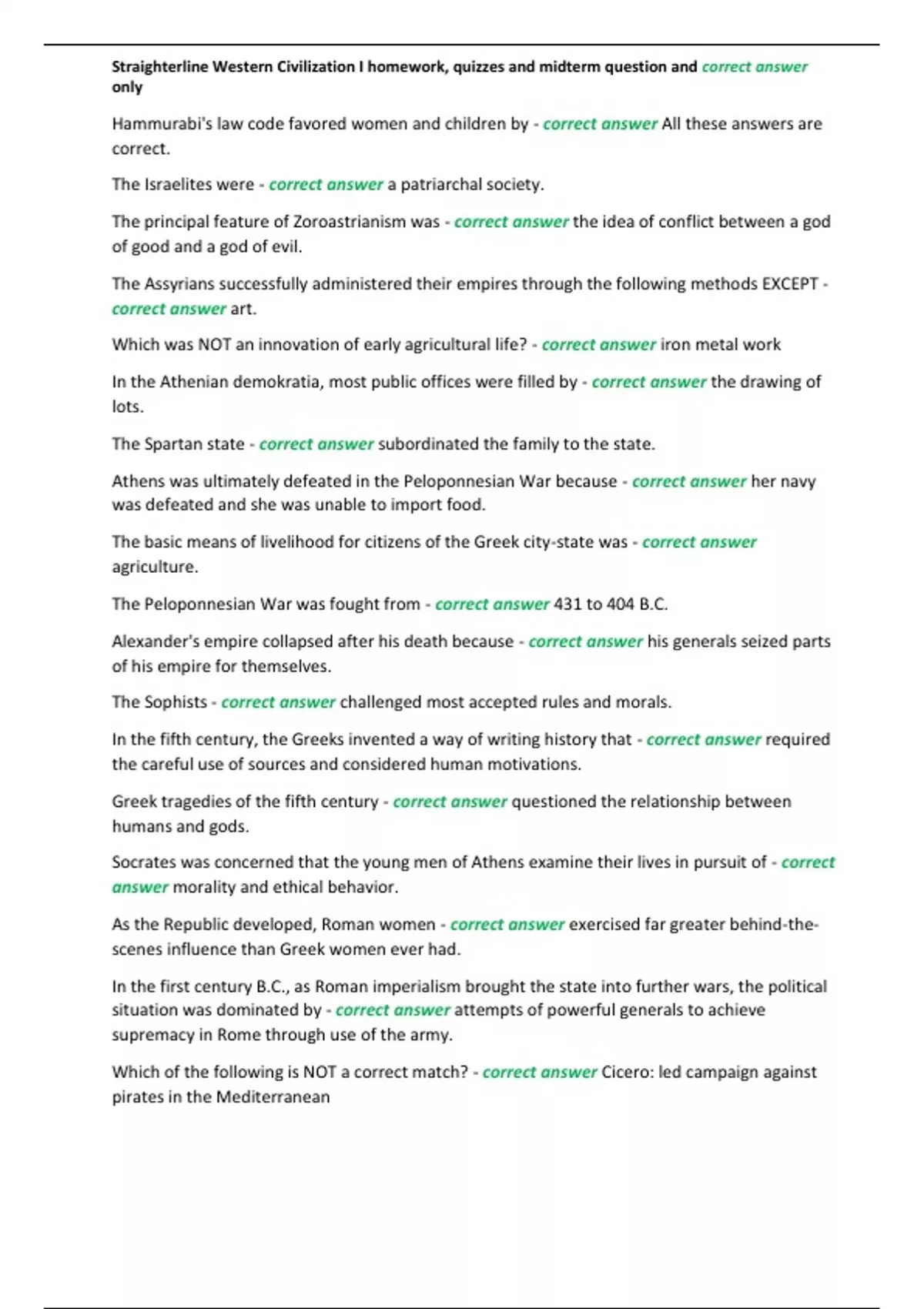 , Straighterline Western Civilization I homework, quizzes and midterm question and correct answer