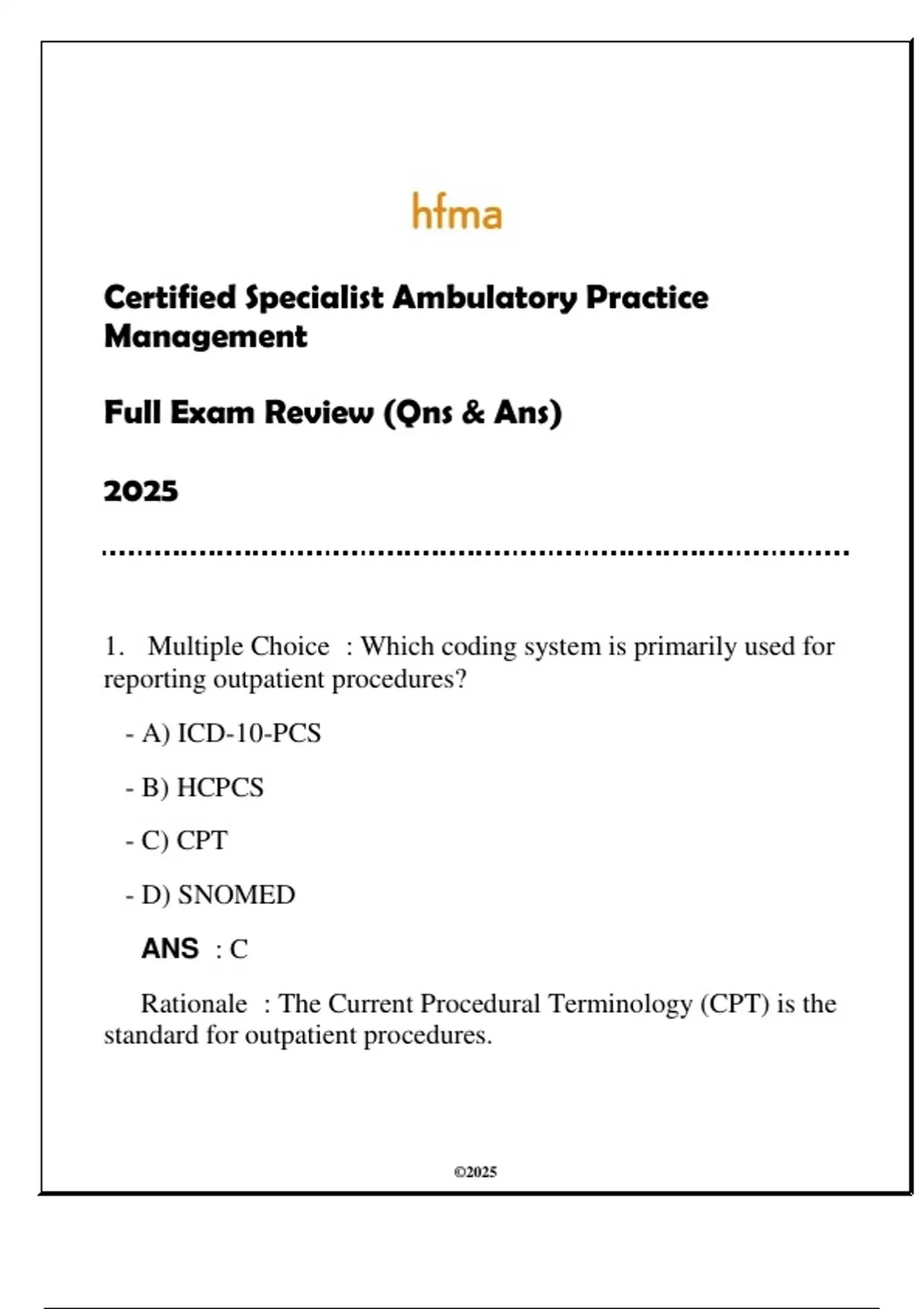 Rationale : The Current Procedural Terminology (CPT) is the