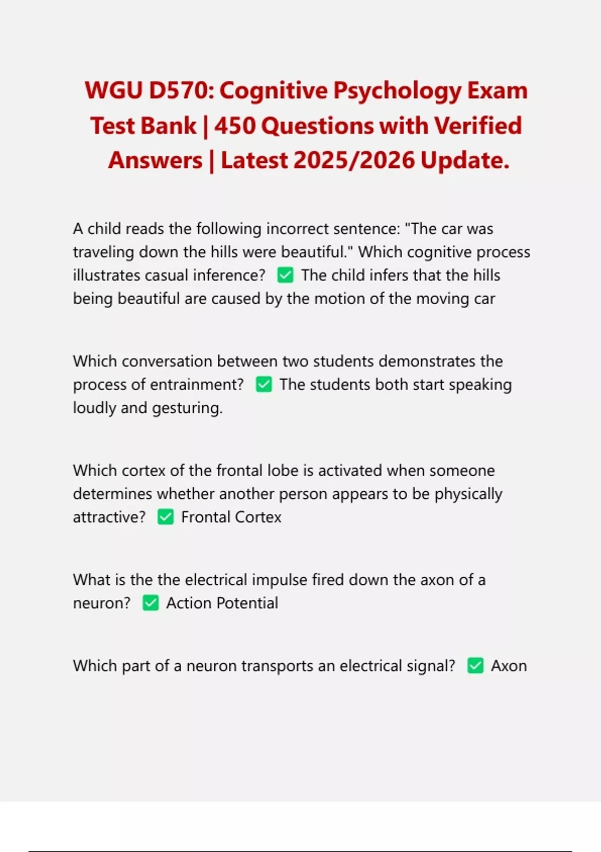 WGU D570: Cognitive Psychology Exam Test Bank | 450 Questions with Verified Answers | Latest 2025/2026 Update.
