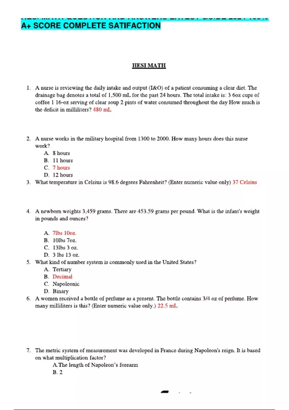 HESI MATH QUESTION AND ANSWERS LATEST GUIDE 2024 100- A+ SCORE COMPLETE