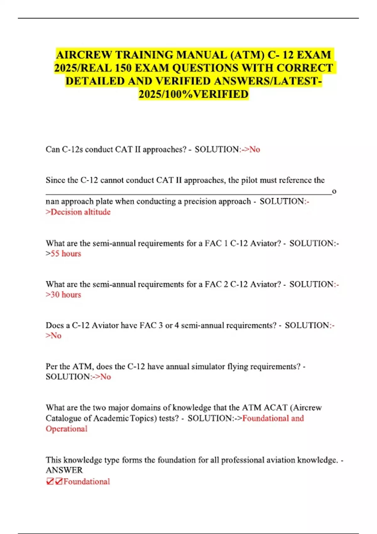 AIRCREW TRAINING MANUAL (ATM) C- 12 EXAM 2025/REAL 150 EXAM QUESTIONS WITH CORRECT DETAILED AND VERIFIED ANSWERS/LATEST-2025/100%VERIFIED