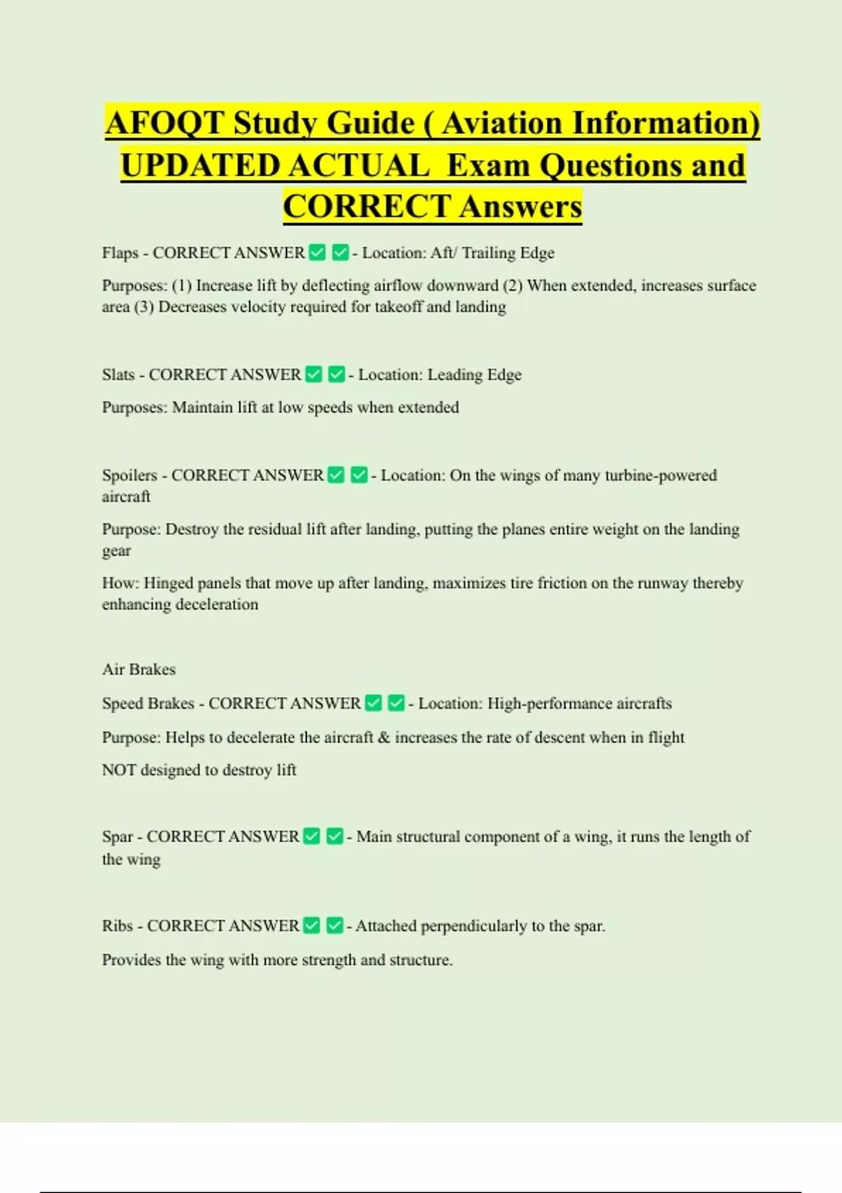 AFOQT Study Guide ( Aviation Information) UPDATED ACTUAL Exam Questions and CORRECT Answers Flaps - CORRECT ANSWER - Location: Aft/ Trailing Edge Purposes: (1) Increase lift by deflecting airflow downward (2) When extended, increases surface area (3) Decreases velocity required for takeoff and landing Slats - CORRECT ANSWER - Location: Leading Edge Purposes: Maintain lift at low speeds when extended