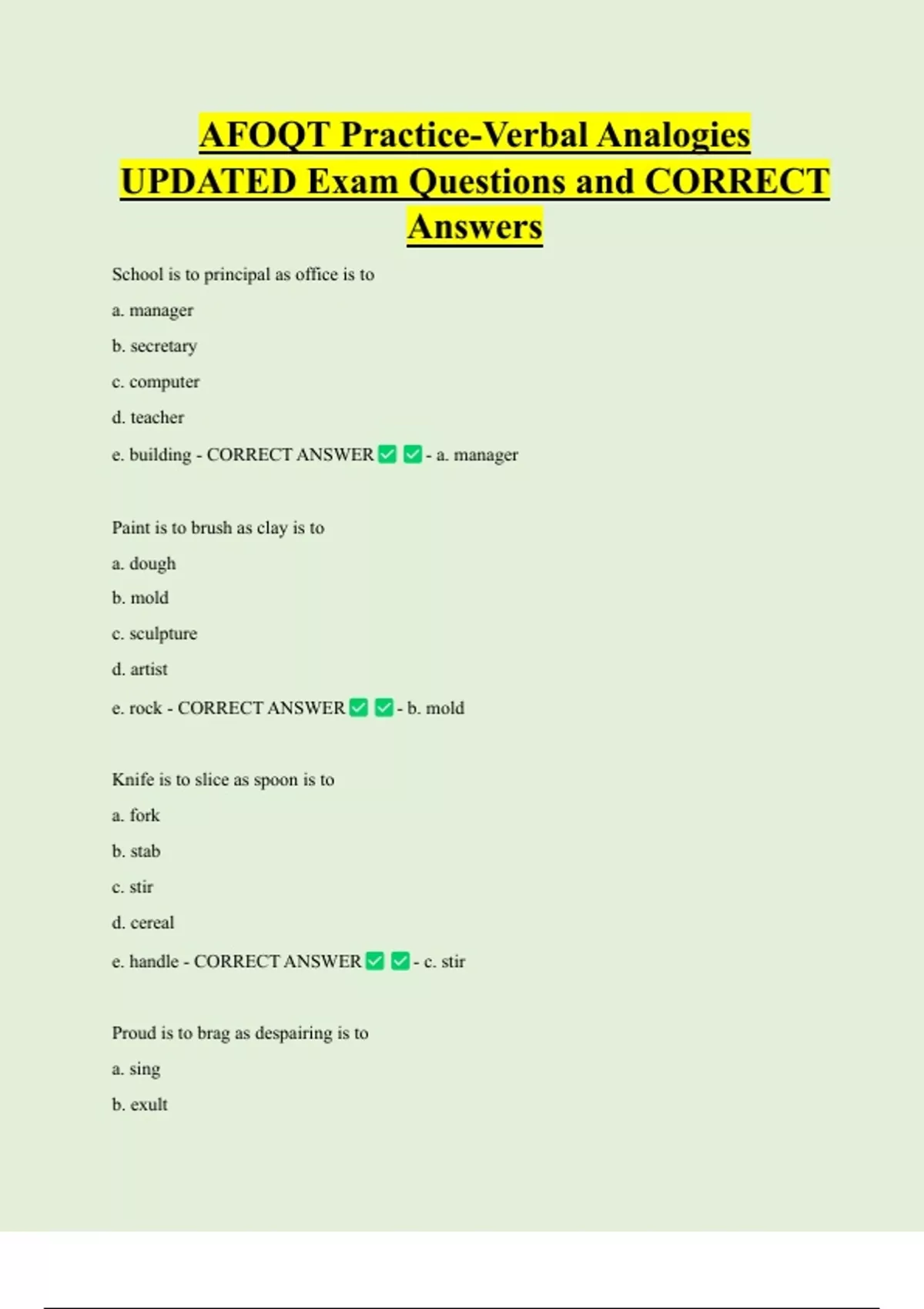 AFOQT Practice-Verbal Analogies UPDATED Exam Questions and CORRECT Answers School is to principal as office is to a. manager b. secretary c. computer d. teacher e. building - CORRECT ANSWER Paint is to brush as clay is to a. dough b. mold c. sculpture d. artist e. rock - CORRECT ANSWER Knife is to slice as spoon is to a. fork b. stab c. stir d. cereal e. handle - CORRECT ANSWER Proud is to brag as despairing is to a. sing - a. manager