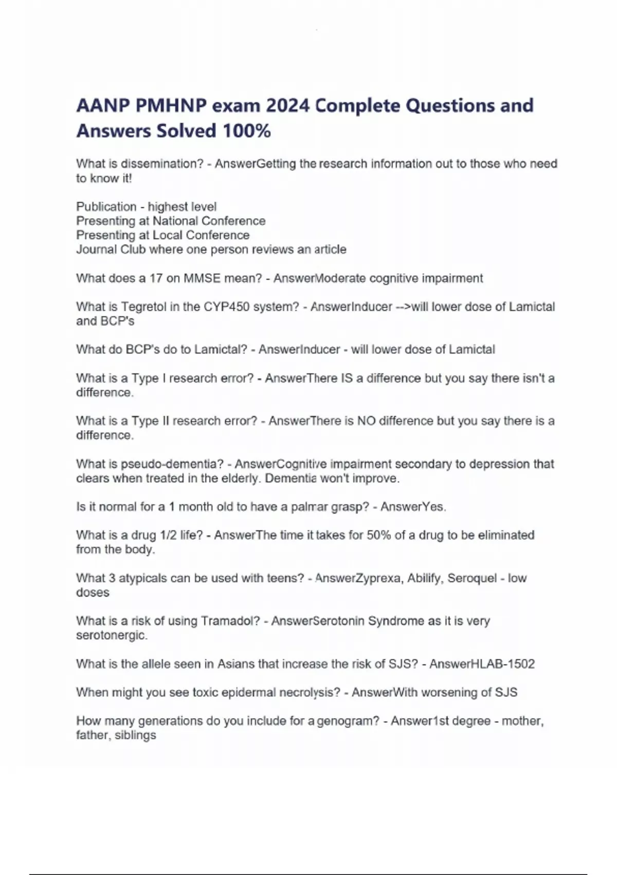 AANP PMHNP exam 2024 Complete Questions and Answers Solved 100% What is dissemination? - AnswerGetting the research information out to those who need to know it! Publication - highest level Presenting at National Conference Presenting at Local Conference Journal Club where one person reviews an article What does a 17 on MMSE mean? - AnswerModerate cognitive impairment What is Tegretol in the CYP450 system? - AnswerInducer -->will lower dose of Lamictal and BCP's What do BCP's do to Lamictal? - AnswerInducer - will lower dose of Lamictal What is a Type I research error? - AnswerThere IS a difference but you say there isn't a difference. What is a Type II research error? - AnswerThere is NO difference but you say there is a difference. What is pseudo-dementia? - AnswerCognitive impairment secondary to depression that clears when treated in the elderly. Dementia won't improve. Is it normal for a 1 month old to have a palmar grasp? - AnswerYes. What is a drug 1/2 life? - AnswerThe time it takes for 50% of a drug to be eliminated from the body. What 3 atypicals can be used with teens? - AnswerZyprexa, Abilify, Seroquel - low doses What is a risk of using Tramadol? - AnswerSerotonin Syndrome as it is very serotonergic. What is the allele seen in Asians that increase the risk of SJS? - AnswerHLAB-1502 When might you see toxic epidermal necrolysis? - AnswerWith worsening of SJS How many generations do you include for a genogram? - Answer1st degree - mother, father, siblings 2nd degree - grandparents & cousins 3rd degree - What does messenger RNA code for? - AnswerAmino Acids What is epigenetics? - AnswerFactors that affect genes - environmental, smoking, stress, etc... What part of the brain is involved with OCD? - AnswerBasal Ganglia Occipito-Frontal What happens to the brain during adolescence? - AnswerDendritic pruning Emotions are controlled by amygdala By adulthood, PFC involved as well