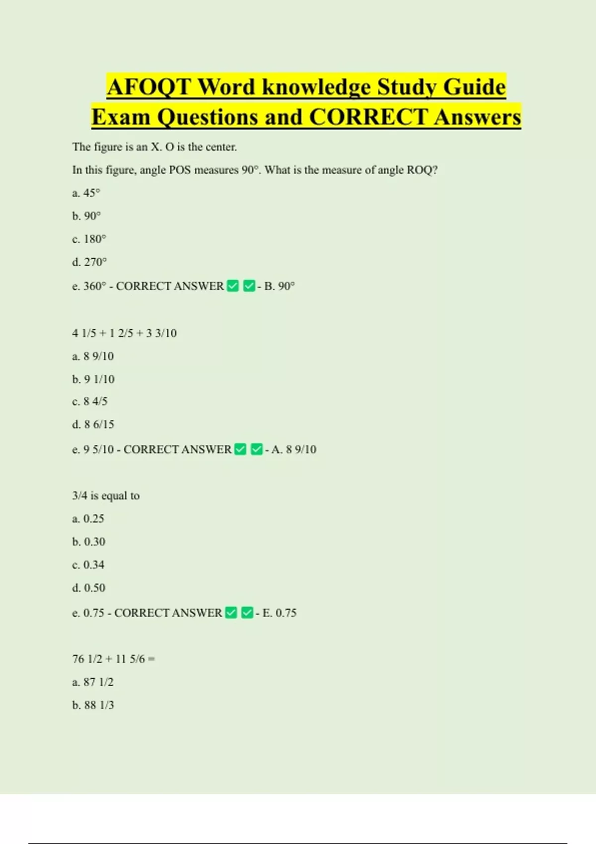 AFOQT Word knowledge Study Guide Exam Questions and CORRECT Answers The figure is an X. O is the center. In this figure, angle POS measures 90°. What is the measure of angle ROQ? a. 45° b. 90° c. 180° d. 270° e. 360° - CORRECT ANSWER 4 1/5 + 1 2/5 + 3 3/10 a. 8 9/10 b. 9 1/10 c. 8 4/5 d. 8 6/15 e. 9 5/10 - CORRECT ANSWER 3/4 is equal to a. 0.25 b. 0.30 c. 0.34 d. 0.50 e. 0.75 - CORRECT ANSWER 76 1/2 + 11 5/6 = a. 87 1/2 b. 88 1/3 - B. 90°
