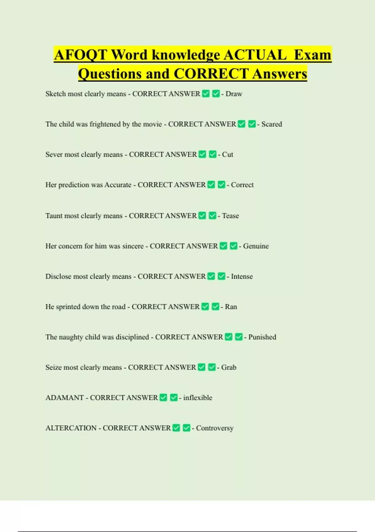 AFOQT Word knowledge ACTUAL Exam Questions and CORRECT Answers Sketch most clearly means - CORRECT ANSWER - Draw The child was frightened by the movie - CORRECT ANSWER Sever most clearly means - CORRECT ANSWER Her prediction was Accurate - CORRECT ANSWER Taunt most clearly means - CORRECT ANSWER - Cut - Correc