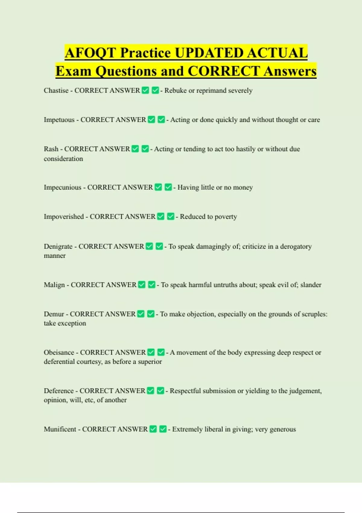 AFOQT Practice UPDATED ACTUAL Exam Questions and CORRECT Answers Chastise - CORRECT ANSWER Impetuous - CORRECT ANSWER Rash - CORRECT ANSWER consideration Impecunious - CORRECT ANSWER Impoverished - CORRECT ANSWER Denigrate - CORRECT ANSWER manner Malign - CORRECT ANSWER Demur - CORRECT ANSWER take exception Obeisance - CORRECT ANSWER - Rebuke or reprimand severely - Acting or done quickly and without thought or care - Acting or tending to act too hastily or without due - Having little or no money