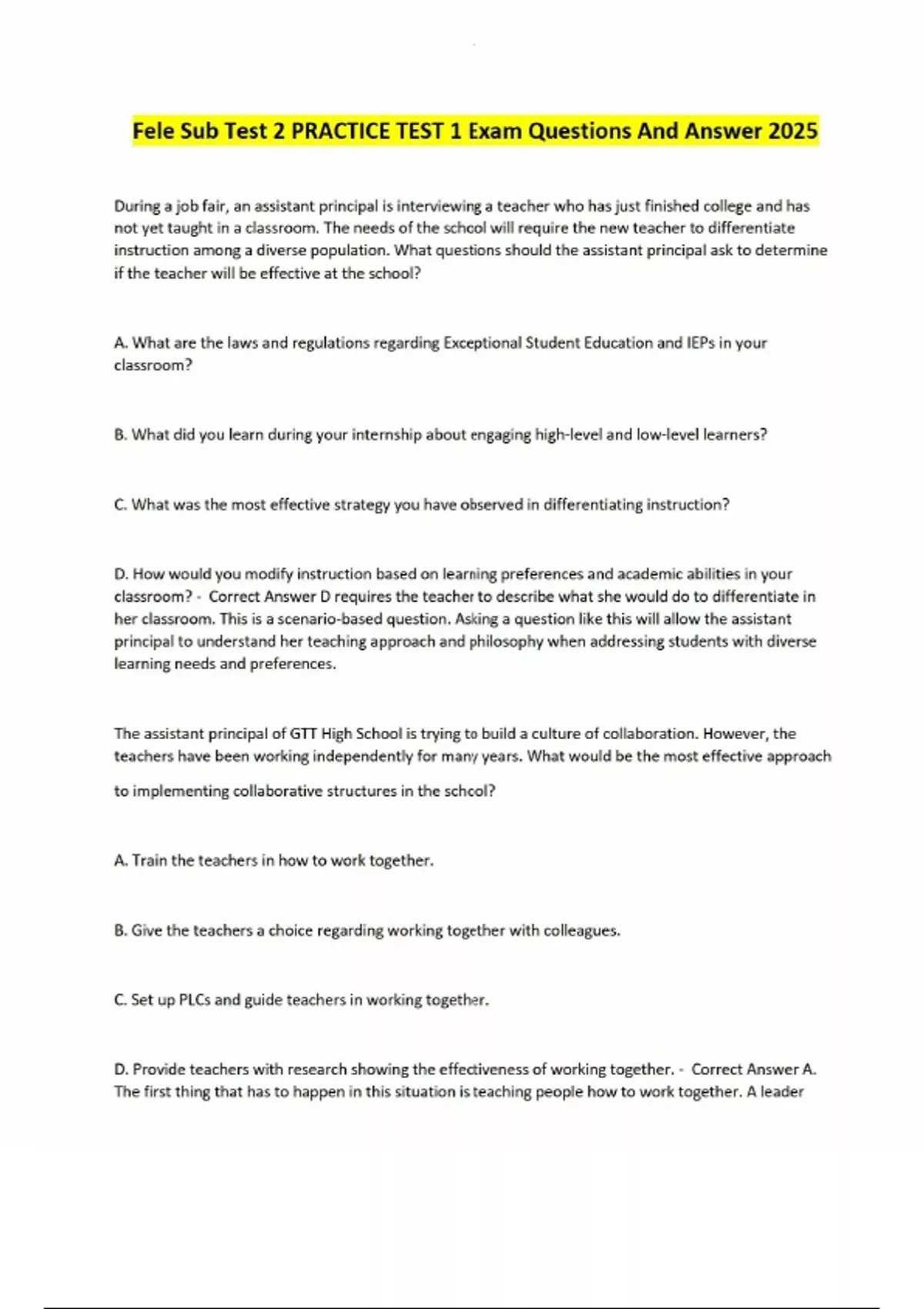 Fele Sub Test 2 PRACTICE TEST 1 Exam Questions And Answer 2025 During a job fair, an assistant principal is interviewing a teacher who has just finished college and has not yet taught in a classroom. The needs of the school will require the new teacher to differentiate instruction among a diverse population. What questions should the assistant principal ask to determine if the teacher will be effective at the school? A. What are the laws and regulations regarding Exceptional Student Education and IEPs in your classroom? B. What did you learn during your internship about engaging high-level and low-level learners? C. What was the most effective strategy you have observed in differentiating instruction? D. How would you modify instruction based on learning preferences and academic abilities in your classroom? - Correct Answer D requires the teacher to describe what she would do to differentiate in her classroom. This is a scenario-based question. Asking a question like this will allow the assistant principal to understand her teaching approach and philosophy when addressing students with diverse learning needs and preferences. The assistant principal of GTT High School is trying to build a culture of collaboration. However, the teachers have been working independently for many years. What would be the most effective approach to implementing collaborative structures in the school?