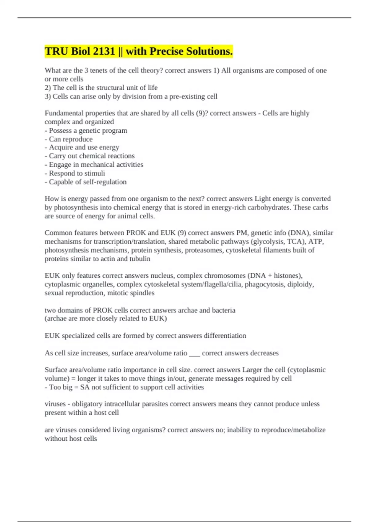 What are the 3 tenets of the cell theory? correct answers 1) All organisms are composed of one or more cells 2) The cell is the structural unit of life 3) Cells can arise only by division from a pre-existing cell Fundamental properties that are shared by all cells (9)? correct answers - Cells are highly complex and organized - Possess a genetic program - Can reproduce - Acquire and use energy - Carry out chemical reactions - Engage in mechanical activities - Respond to stimuli - Capable of self-regulation How is energy passed from one organism to the next? correct answers Light energy is converted by photosynthesis into chemical energy that is stored in energy-rich carbohydrates. These carbs are source of energy for animal cells. Common features between PROK and EUK (9) correct answers PM, genetic info (DNA), similar mechanisms for transcription/translation, shared metabolic pathways (glycolysis, TCA), ATP, photosynthesis mechanisms, protein synthesis, proteasomes, cytoskeletal filaments built of proteins similar to actin and tubulin EUK only features correct answers nucleus, complex chromosomes (DNA + histones), cytoplasmic organelles, complex cytoskeletal system/flagella/cilia, phagocytosis, diploidy, sexual reproduction, mitotic spindles two domains of PROK cells correct answers archae and bacteria (archae are more closely related to EUK) EUK specialized cells are formed by correct answers differentiation As cell size increases, surface area/volume ratio ___ correct answers decreases Surface area/volume ratio importance in cell size. correct answers Larger the cell (cytoplasmic volume) = longer it takes to move things in/out, generate messages required by cell - Too big = SA not sufficient to support cell activities viruses - obligatory intracellular parasites correct answers means they cannot produce unless present within a host cell are viruses considered living organisms? correct answers no; inability to reproduce/metabolize without host cells