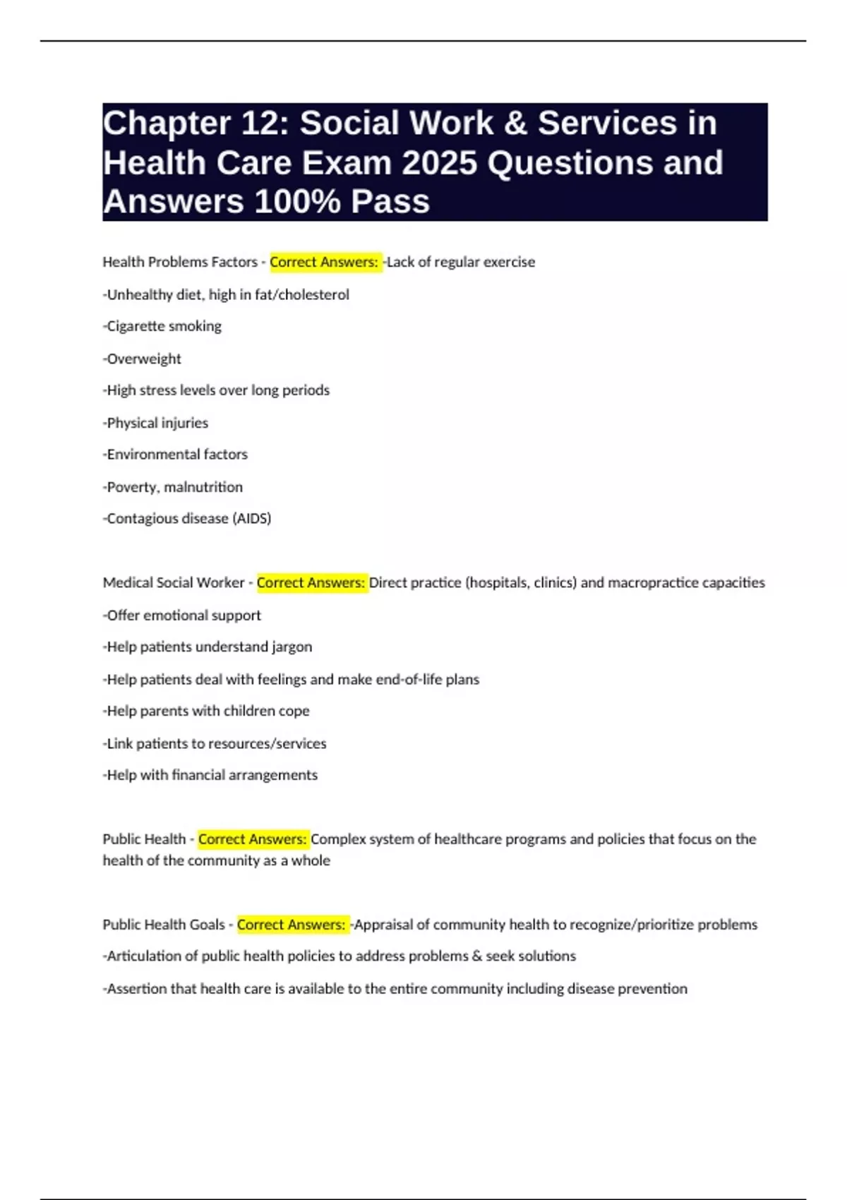 Chapter 12 Social Work & Services in Health Care Exam 2025 Questions and Answers 100- Pass.