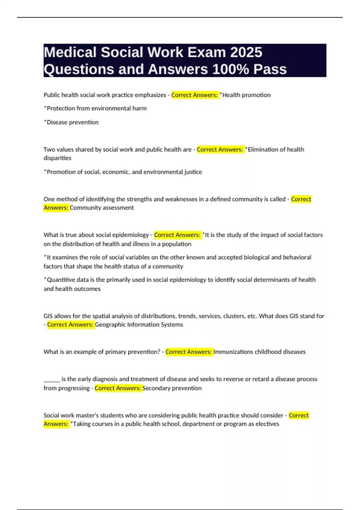 Public health social work practice emphasizes - Correct Answers: *Health promotion