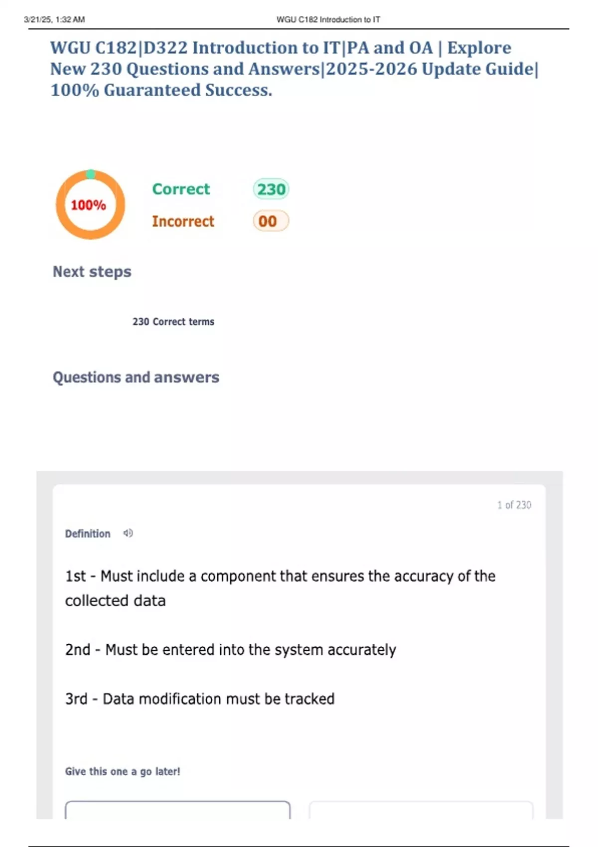 WGU C182|D322 Introduction to IT|PA and OA | Explore New 230 Questions and Answers| Update Guide| 100% Guaranteed Success.