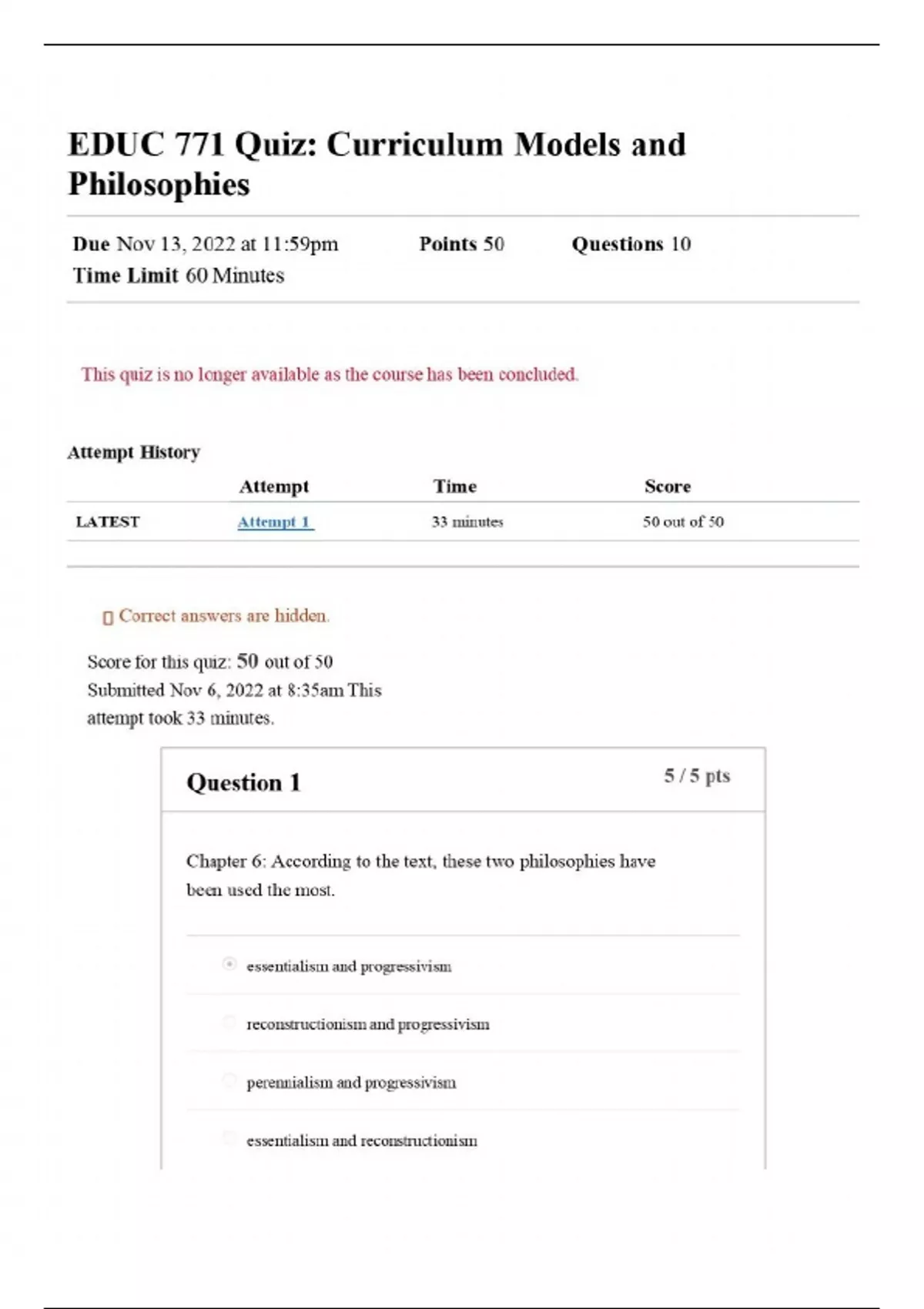 EDUC 771 Quiz: Curriculum Models and Philosophies|Questions and Answers|2025 Update|100% Correct.