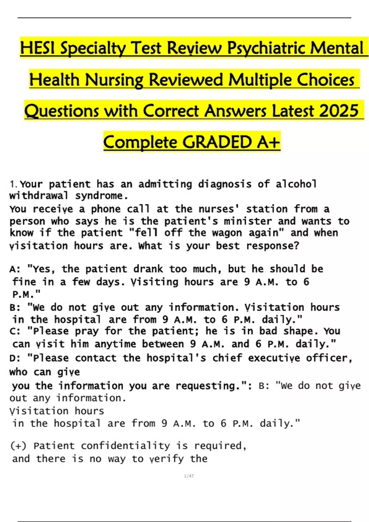 1. Your patient has an admitting diagnosis of alcohol