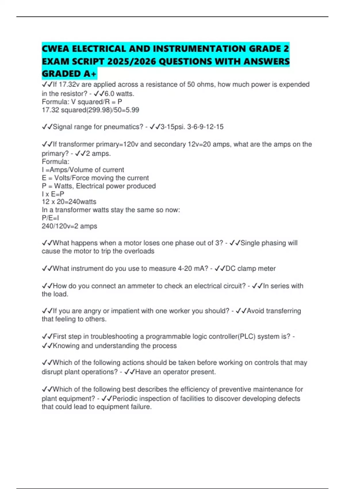 CWEA ELECTRICAL AND INSTRUMENTATION GRADE 2 EXAM SCRIPT 2025/2026 QUESTIONS WITH ANSWERS GRADED A+