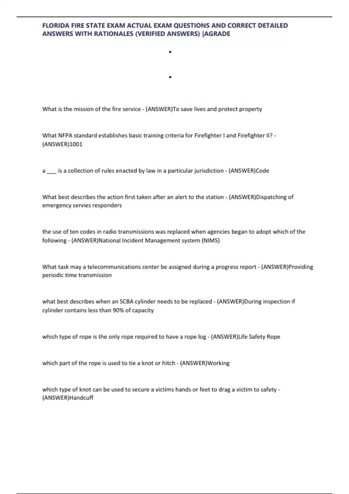 FLORIDA FIRE STATE EXAM ACTUAL EXAM QUESTIONS AND CORRECT DETAILED
