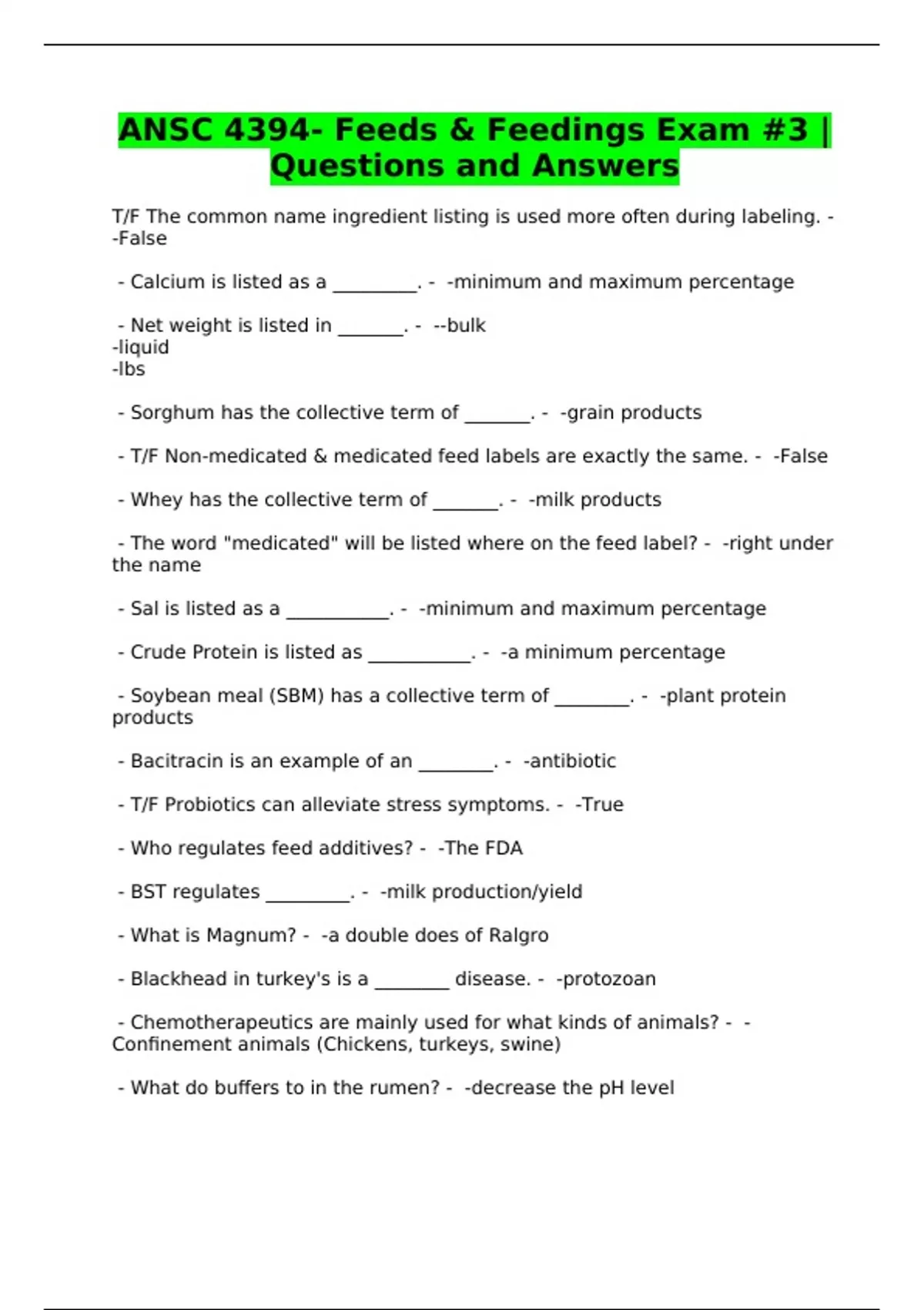 ANSC 4394- Feeds & Feedings Exam #3 |