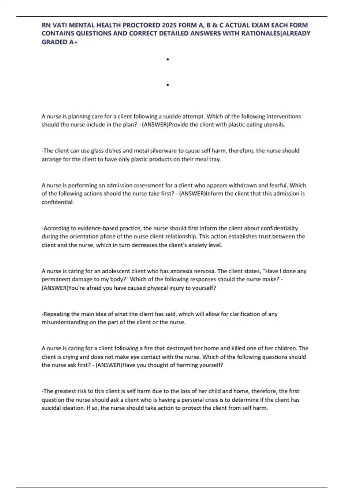 ,RN VATI MENTAL HEALTH PROCTORED 2025 FORM A, B & C ACTUAL EXAM EACH FORM