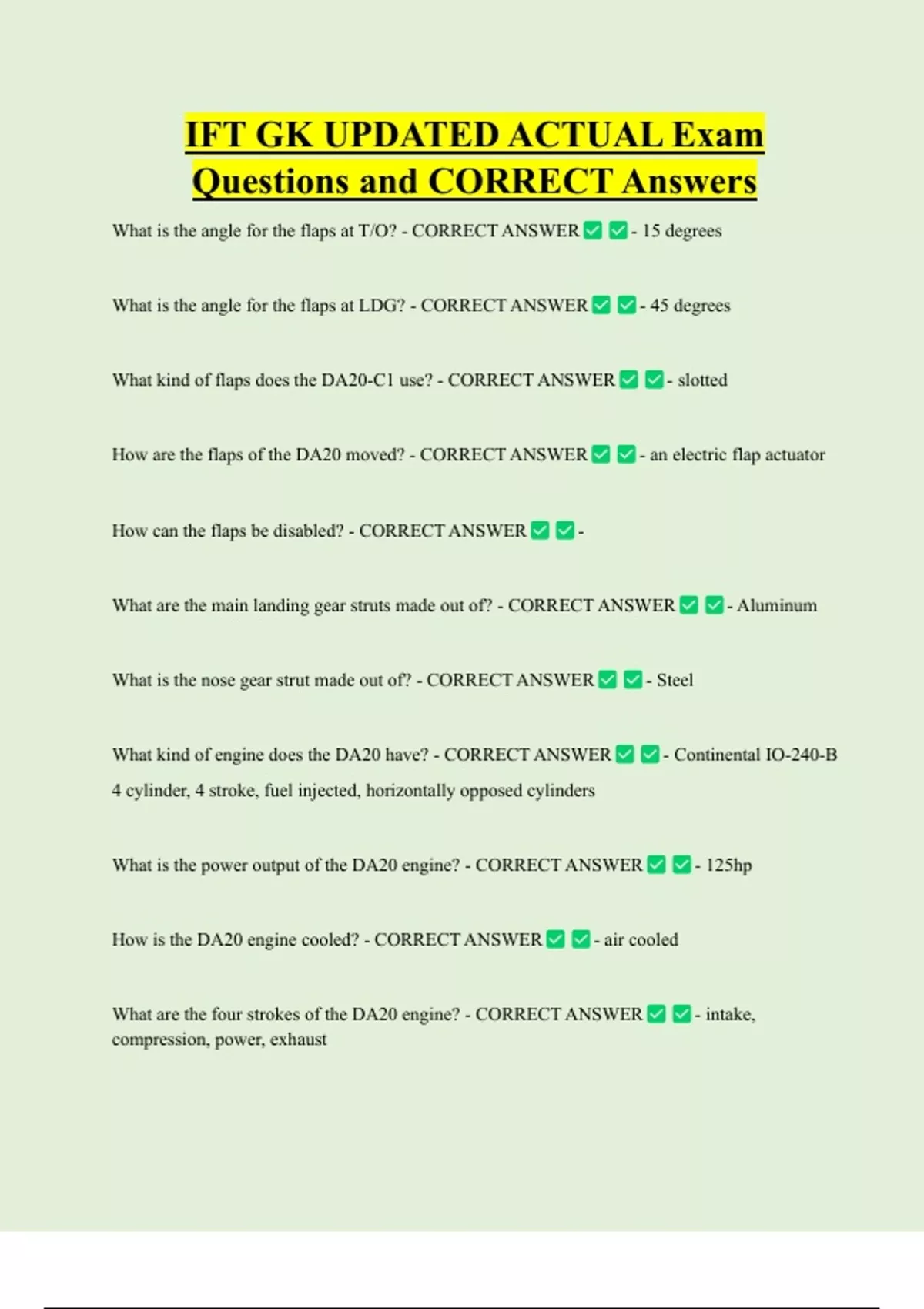 IFT GK UPDATED ACTUAL Exam Questions and CORRECT Answers What is the angle for the flaps at T/O? - CORRECT ANSWER What is the angle for the flaps at LDG? - CORRECT ANSWER What kind of flaps does the DA20-C1 use? - CORRECT ANSWER How are the flaps of the DA20 moved? - CORRECT ANSWER How can the flaps be disabled? - CORRECT ANSWER -