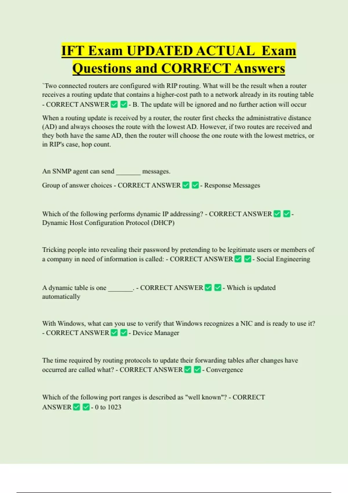 IFT Exam UPDATED ACTUAL Exam Questions and CORRECT Answers `Two connected routers are configured with RIP routing. What will be the result when a router receives a routing update that contains a higher-cost path to a network already in its routing table - CORRECT ANSWER - B. The update will be ignored and no further action will occur When a routing update is received by a router, the router first checks the administrative distance (AD) and always chooses the route with the lowest AD. However, if two routes are received and they both have the same AD, then the router will choose the one route with the lowest metrics, or in RIP's case, hop count. An SNMP agent can send _______ messages. Group of answer choices - CORRECT ANSWER - Response Messages