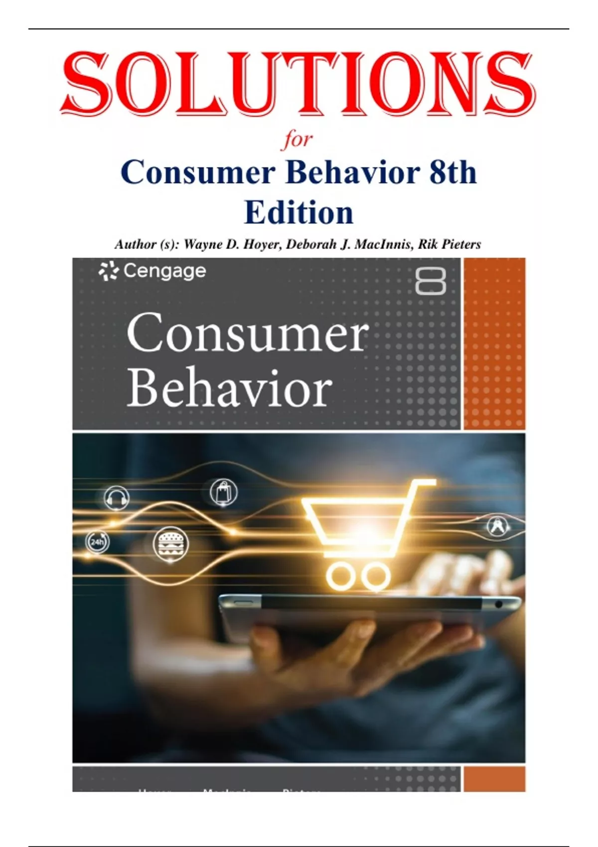 Solutions for Consumer Behavior, 8th Edition by Wayne D. Hoyer. Full Chapters Include;.....Part I: AN INTRODUCTION TO CONSUMER BEHAVIOR. 1. Understanding Consumer Behavior. Appendix: Developing Information about Consumer Behavior. Part II: THE PSYCHOLOGICAL CORE. 2. Motivation, Ability, and Opportunity. 3. From Exposure to Comprehension. 4. Memory and Knowledge. 5. Attitudes Based on High Effort. 6. Attitudes Based on Low Effort. Part III: THE PROCESS OF MAKING DECISIONS. 7. Problem Recognition and Information Search. 8. Judgment and Decision Making Based on High Effort. 9. Judgment and Decision Making Based on Low Effort. 10. Post-Decision Processes. Part IV: THE CONSUMER’S CULTURE. 11. Social Influences on Consumer Behavior. 12. Consumer Diversity. 13. Household and Social Class Influences. 14. Psychographics: Values, Personality, and Lifestyles. Part V: CONSUMER BEHAVIOR OUTCOMES AND ISSUES. 15. Innovations: Adoption, Resistance, Diffusion. 16. Symbolic Consumer Behavior. 17. Marketing, Ethics, and Social Responsibility in Today’s Consumer Society.