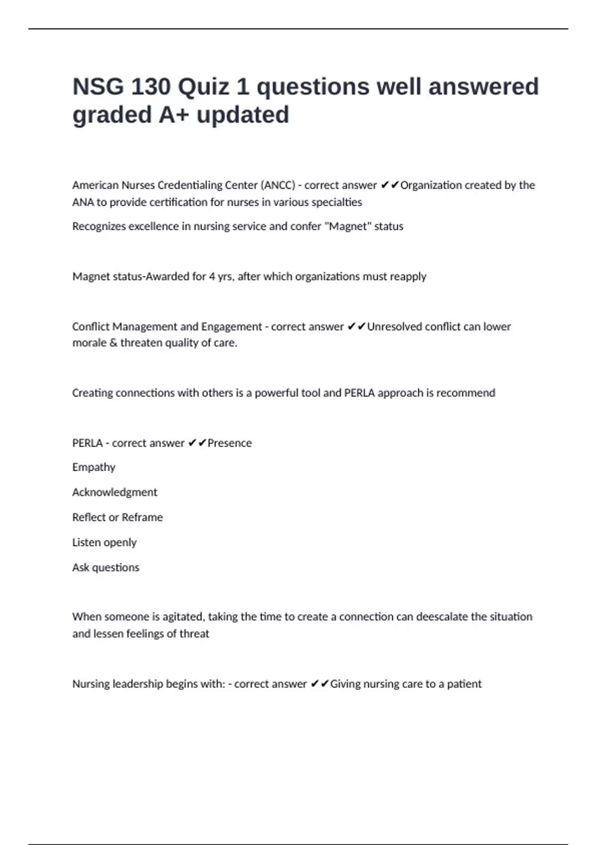 Nursing leadership begins with: - correct answer ✔✔Giving nursing care to a patient